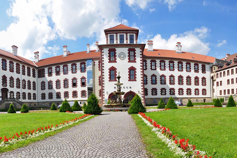 Mehr InformationenAus einer mittelalterlichen Burg mit Kaiserpfalz entwickelte sich, vom barocken Baustil geprägt, eine repräsentative weitläufige Schlossanlage, deren bauliche Vielfalt beeindruckt. Sehenswert sind die spätgotische Schlosskirche und die Festsäle mit ihrer einzigartigen Innenarchitektur und Ausstattung. In stilvollem Ambiente zeigen sich Kunsthandwerk, eine fürstlich geprägte Waffen- und Gemäldesammlung und ein barockes Porzellankabinett. Bedeutend sind ein Konvolut ostasiatischer Porzellane von Bernhard August von Lindenau aus dem Jahr 1845 sowie eine Sammlung historischer und zeitgenössischer Spielkarten. Besonders reizvoll ist die multimediale Kartenmacherwerkstatt, in der einerseits die traditionelle Art und Weise des Druckerhandwerks, andererseits in der Medienwerkstatt modernste Technik zur Herstellung von Kartenbögen präsentiert und für Jedermann angeboten wird.