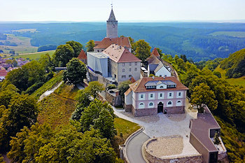 Mehr InformationenDer Stammsitz der Grafen von Schwarzburg wurde im Zuge der Erhebung der Linie Schwarzburg-Rudolstadt in den Fürstenstand (1710) in ein imposantes Barockschloss verwandelt. Die Nationalsozialisten wollten es zum "Reichsgästehaus" umbauen und hinterließen 1942 eine Ruine. Die umfängliche Sanierung von Hauptgebäude und Zeughaus und die dort vorgesehene Präsentation der fürstlichen Waffensammlung machen Schloss Schwarzburg wieder zur bedeutenden Sehenswürdigkeit. Weitgehend original erhalten ist das Kaisersaalgebäude, eine Orangerie mit einem Gedächtsnisprogramm von Kaiserporträts. In deren Mitte ist auch der 1349 zum Gegenkönig gekürte Günther XXI. von Schwarzburg zu sehen. Eine Ausstellung präsentiert die Schwarzburger Dynastie, das Schloss und die Schwarzburger Porzellanmanufaktur.