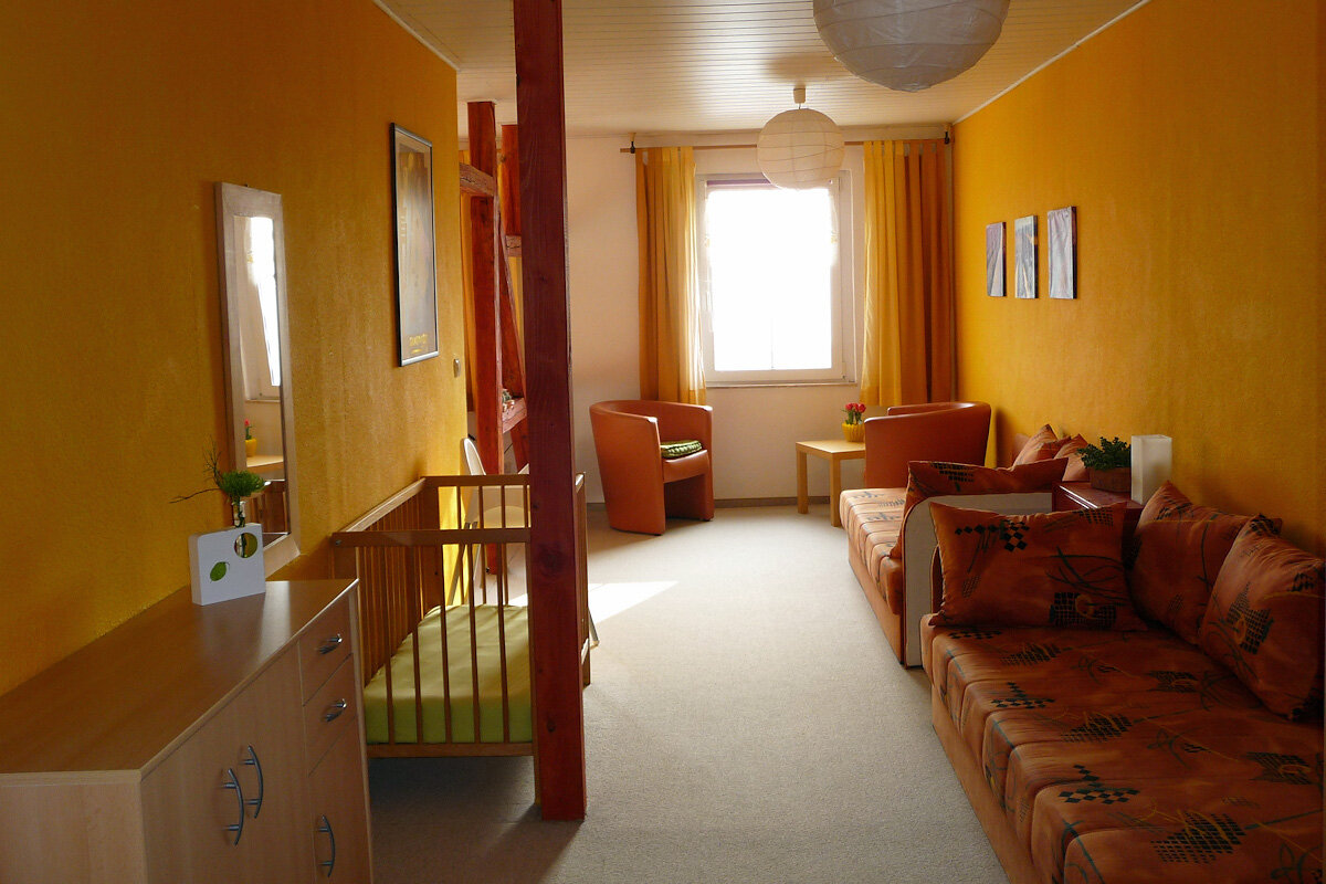 Über einen eigenen Eingang gelangen Sie in die ca. 55 m2 große Wohnung. Diese bietet bis zu 4 Personen + 1 Kind ausreichend Platz. Gegliedert ist sie in einen schön geschnittenen Wohnraum mit offener Küche und einem großen geteilten Schlafraum. Im Sanitärbereich finden Sie ein Bad mit Dusche. Das WC ist separat. Bettwäsche und Handtücher gehören selbstverständlich zur Ausstattung.
