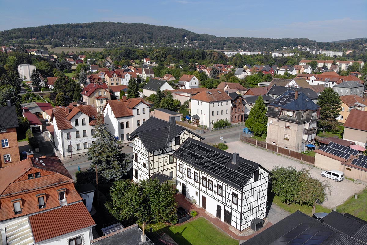Das Ferienhaus befindet sich im Stadtteil Volkstedt, unweit vom steilen Saaleufer, der Rudolstädter Reviera mit seiner Schiller-Gedenkstätte „Schillershöhe“. Alle Sehenswürdigkeiten der Stadt erreichen sie fußläufig. Ca. 200 m vom Ferienhaus entfernt finden Sie die Bäckerei Wolf mit Cafe` sowie die Landfleischerei Kleingeschwenda. Das Gasthaus „Zum Anker“ befindet sich wenige Meter von Ferienhaus entfernt und bietet traditionelle Thüringer Küche. Ein weiteres Restaurant in der Nähe ist die „Gondelstation“, direkt am Saaleufer.