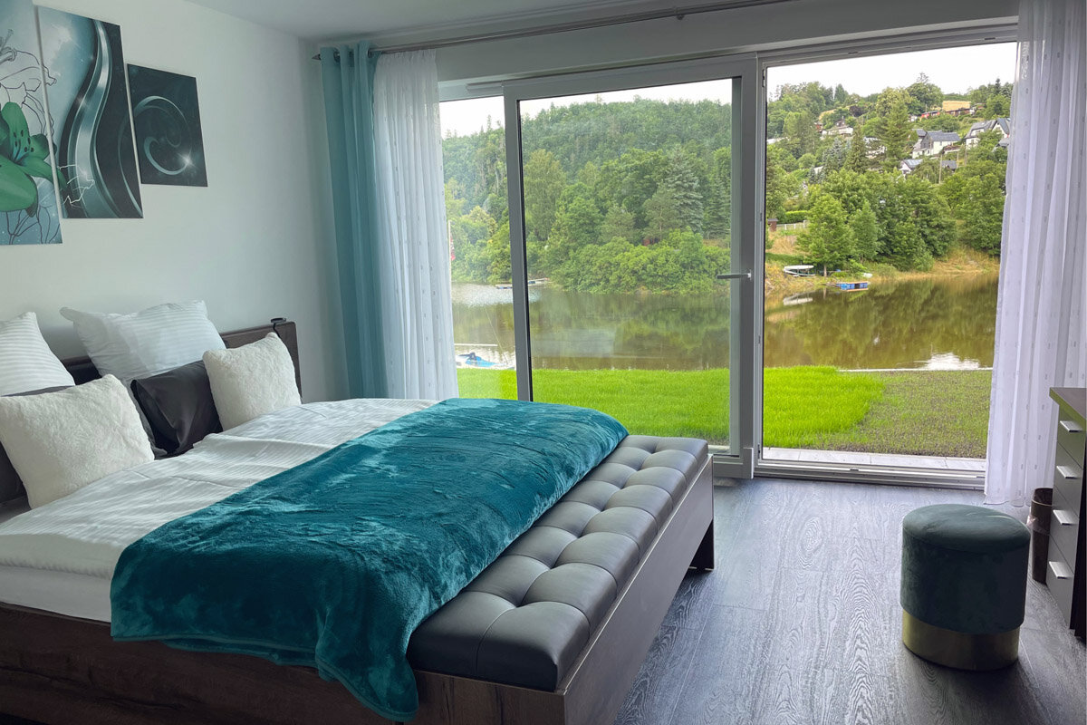 120 m² im OG mit Balkon und Seelblick, für 6 Personen, 2 Einzelbetten, 1 Queensize-Bett, 1 Kingsize-Bett