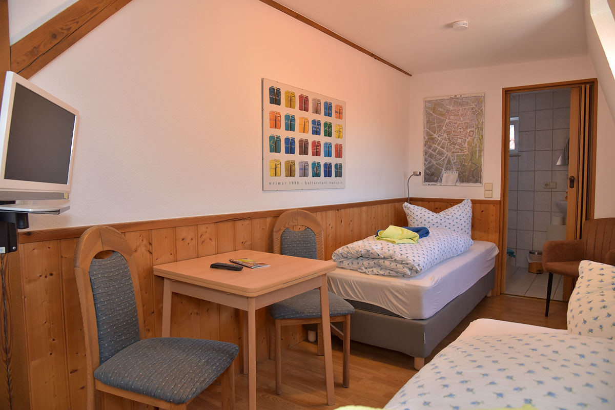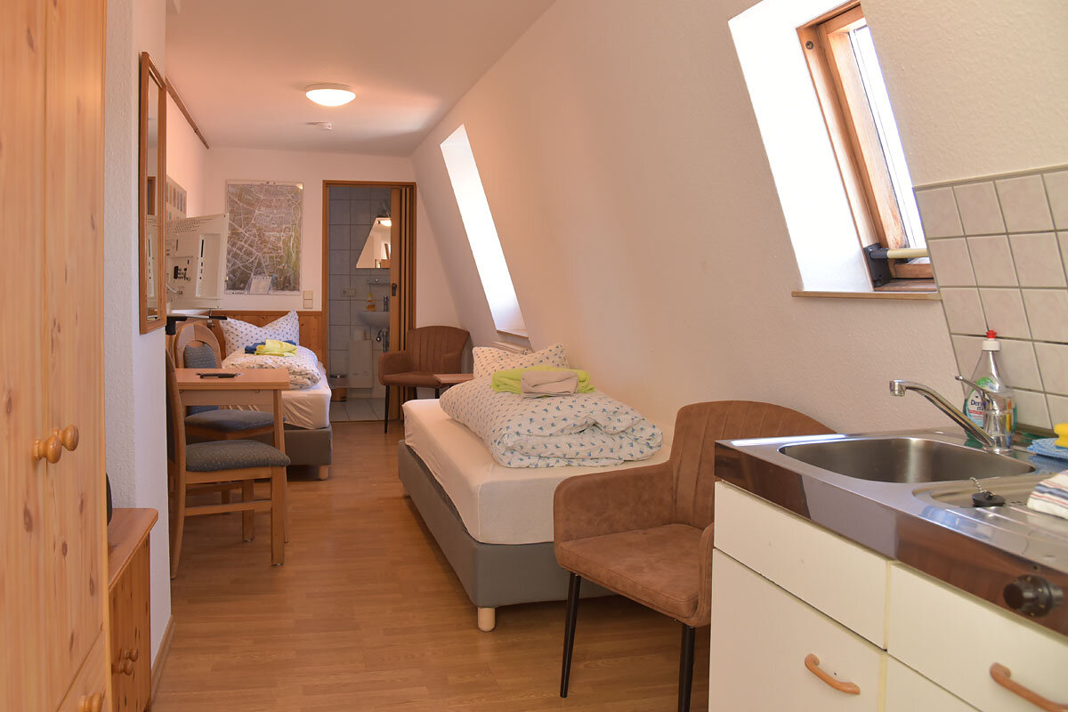 Unsere hell und freundlich eingerichteten Appartements sind ausgestattet mit einem Wohn-/ Schlafraum, TV, Dusche/WC und einer komplett eingerichteten Küche.