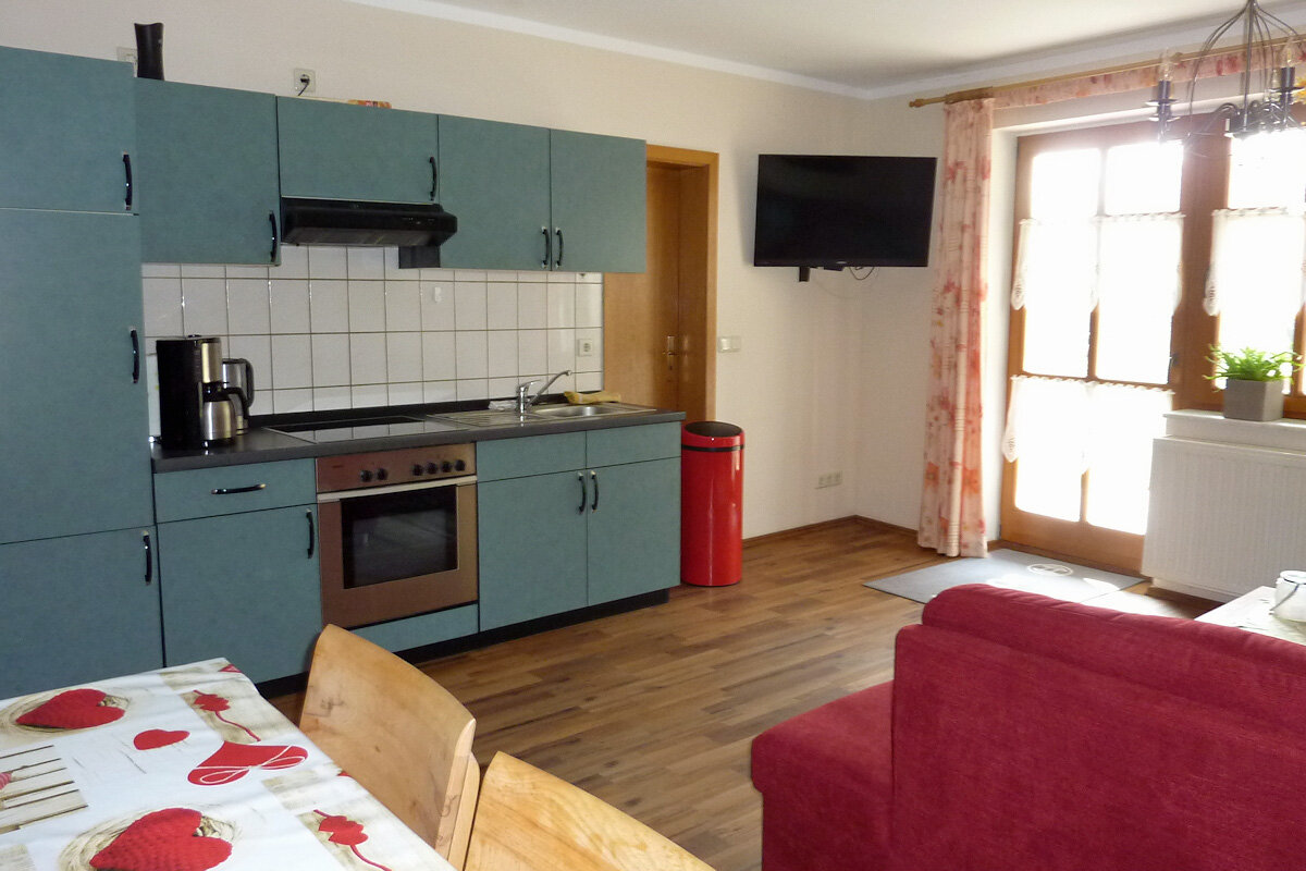 kleine Küchenzeile und eine Essecke, Couch, Flachbild-TV