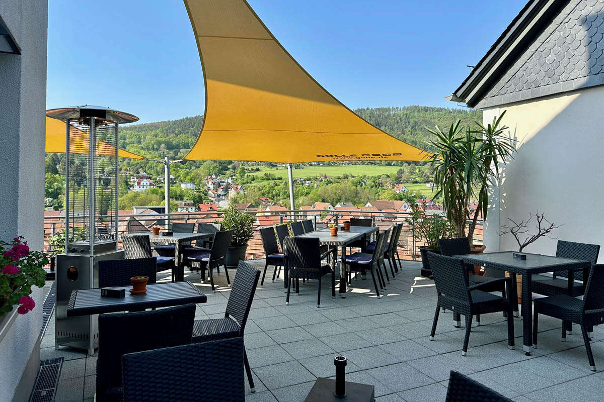 Besuchen Sie unser mittels Aufzug barrierefrei erreichbares Terrassen-Café mit seinem einzigartigen Ausblick auf die Stadt, von sanften Hügeln und Wäldern umgeben.