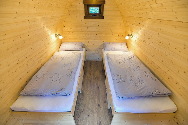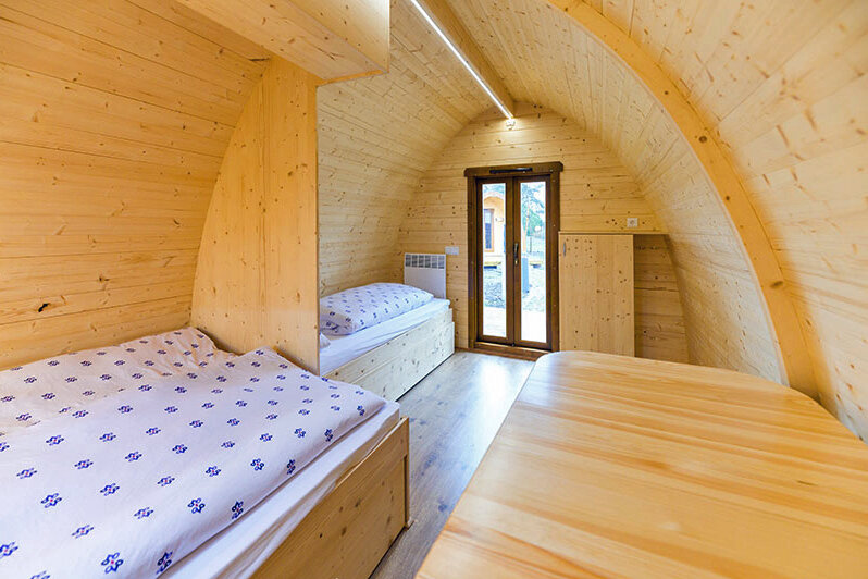 Für unsere Gäste, die ohne eigene Unterkunft anreisen, bieten wir wintertaugliche Campinghütten (Trekking & Family Pod) mit 2 bis 4 Betten an.