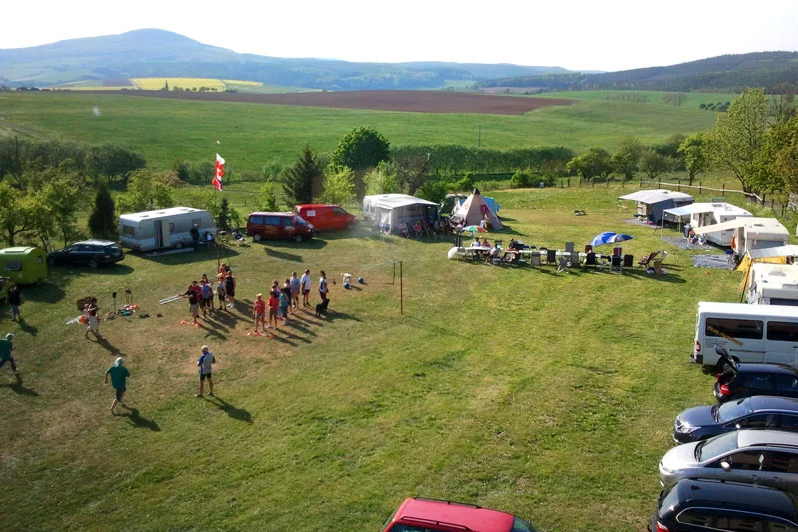Urlaub unter freiem Himmel, umgeben von der idyllischen Landschaft der Rhön in Thüringen: Unser Campingplatz verspricht Outdoor-Spaß pur. Die Grünfläche direkt hinter dem Familienhotel Rhön Feeling im ruhigen Örtchen Bernshausen bietet Platz für Wohnmobile und Wohnwagen oder Zeltplätze.