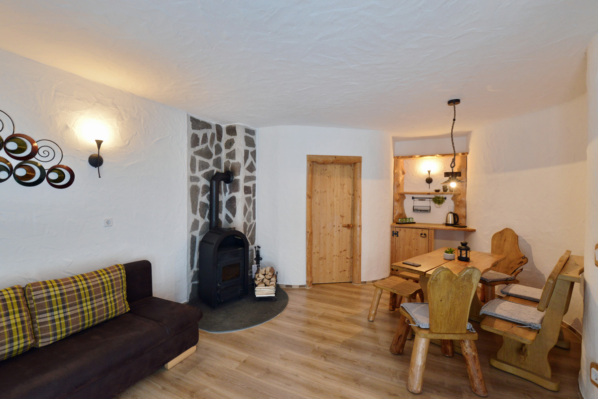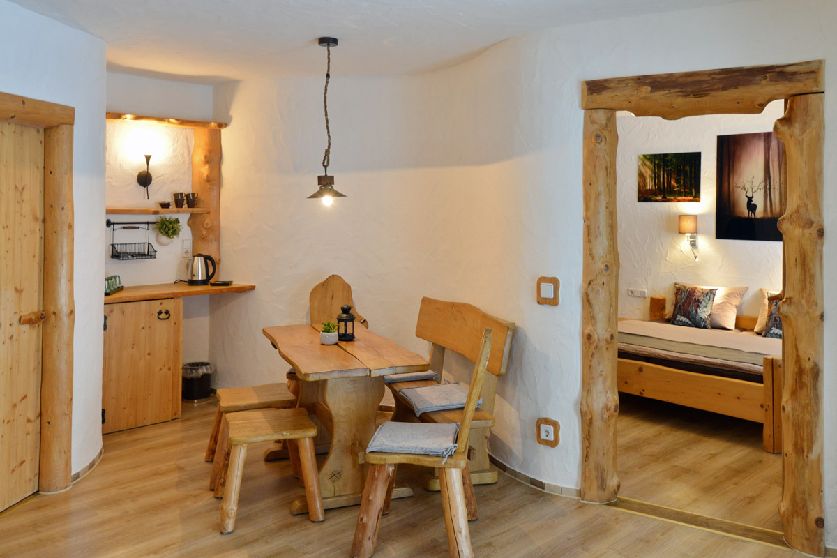 Jedes unserer acht Erdhäuser ist urig und zugleich komfortabel eingerichtet und verfügt auf 45m² über ein Schlafzimmer mit einem Doppel- und einem Doppelstockbett, ein Wohnzimmer, ein Badezimmer sowie eine eigene Terrasse. Die maßgefertigte Eichen- und Rundholzeinrichtung ist ein Unikat und verleiht den Erdhäusern ihren urigen Charme. Ein Erdhaus bietet Platz für zwei bis vier Personen. Buche deinen Wohlfühlurlaub und genieße die kostbare Urlaubszeit in trauter Zweisamkeit, mit der ganzen Familie oder mit Freunden.