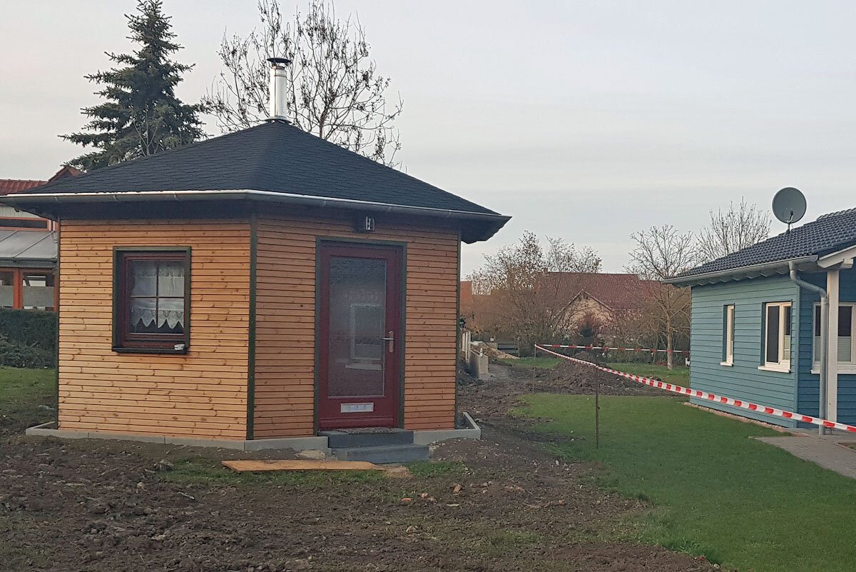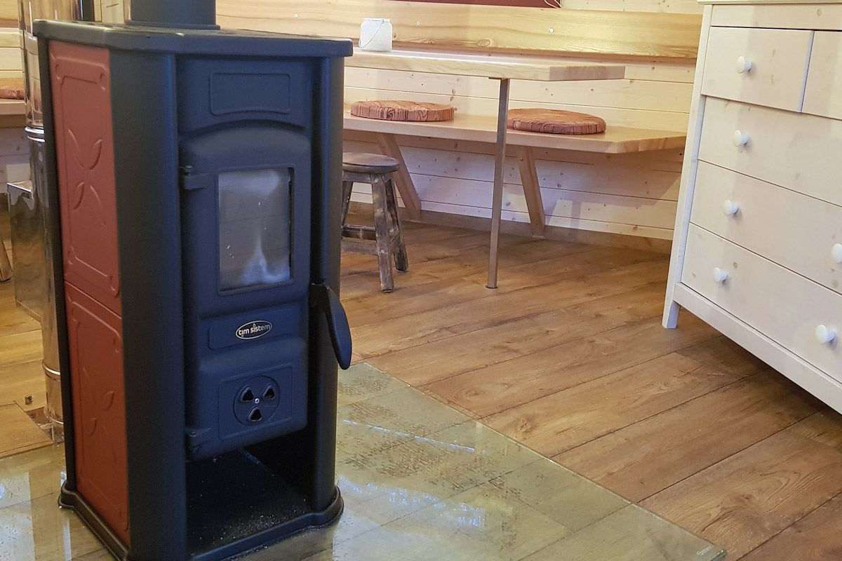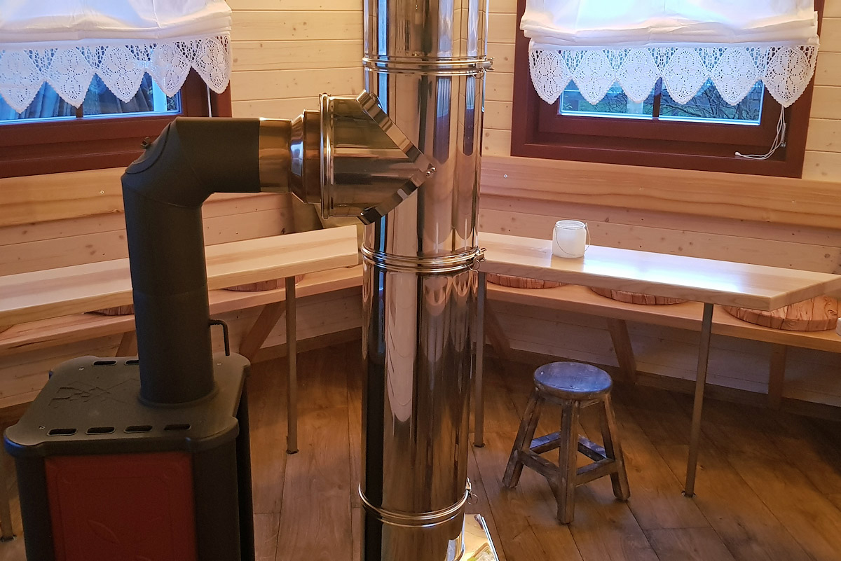 Neu ist unsere Gemeinschaftshütte mit Holzofen. Dort können Sie gemütlich sitzen und feiern (Platz für ca. 13 Personen). Wenn beide Ferienhäuser zusammen gebucht sind, kann die Hütte zum gemeinsamen Frühstück genutzt werden.