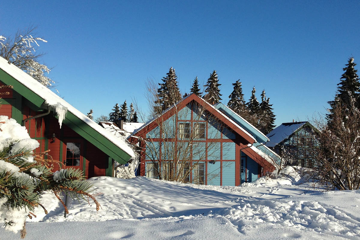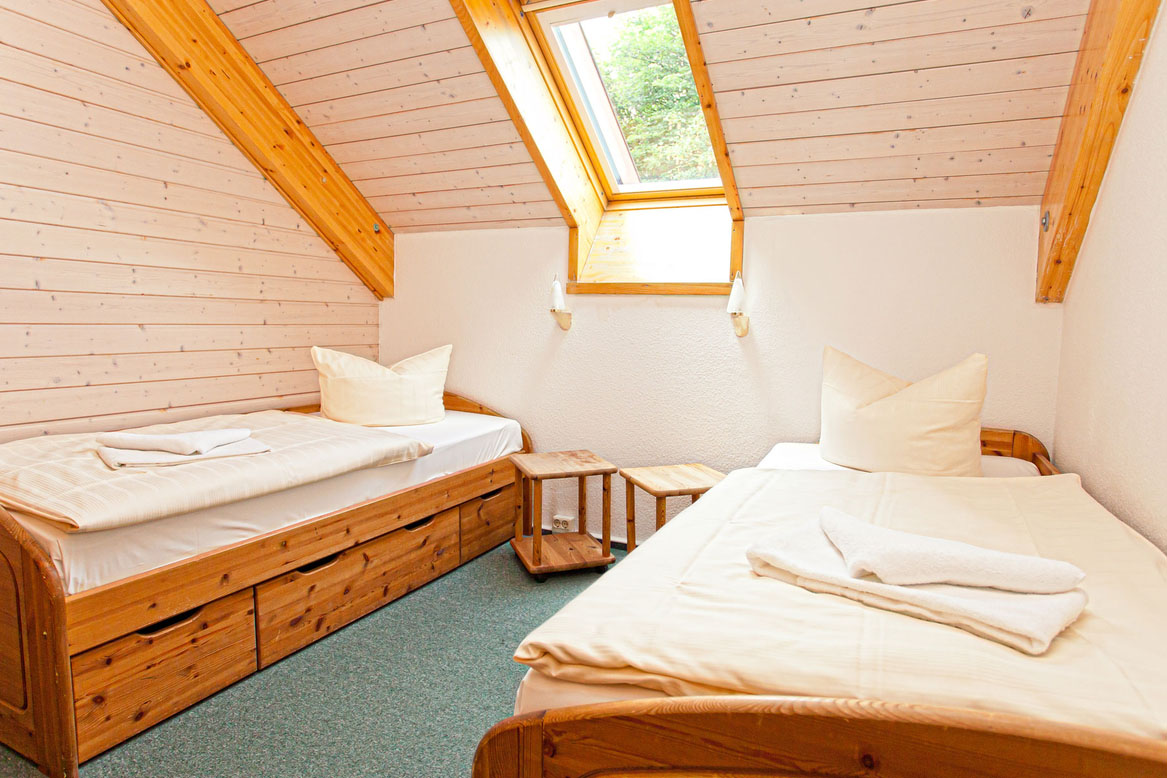 In unseren 8 rustikal eingerichteten Ferienhäusern in Oberhof finden Sie auf 90 qm einen offenen Wohn-, Ess- und Küchenbereich und im Obergeschoss drei Schlafzimmer für je zwei Personen und eine Dusche mit WC.