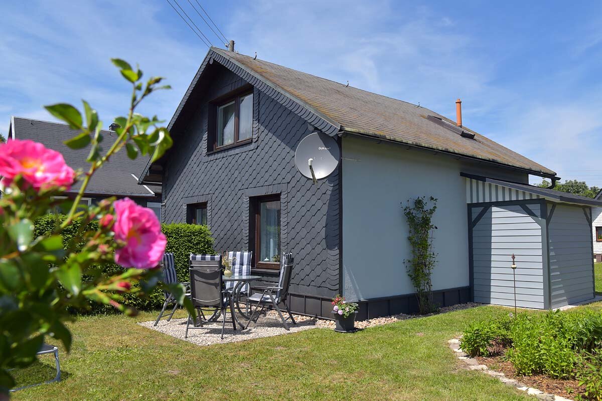 Auf einem sonnigen Grundstück befindet sich unser in 2019 neu eingerichtetes Ferienhaus. Umgeben von einem Garten mit Liegewiese und zahlreichen Blumen können Sie hier einen erholsamen Urlaub in Schmiedefeld am Rennsteig / Thüringer Wald verbringen.