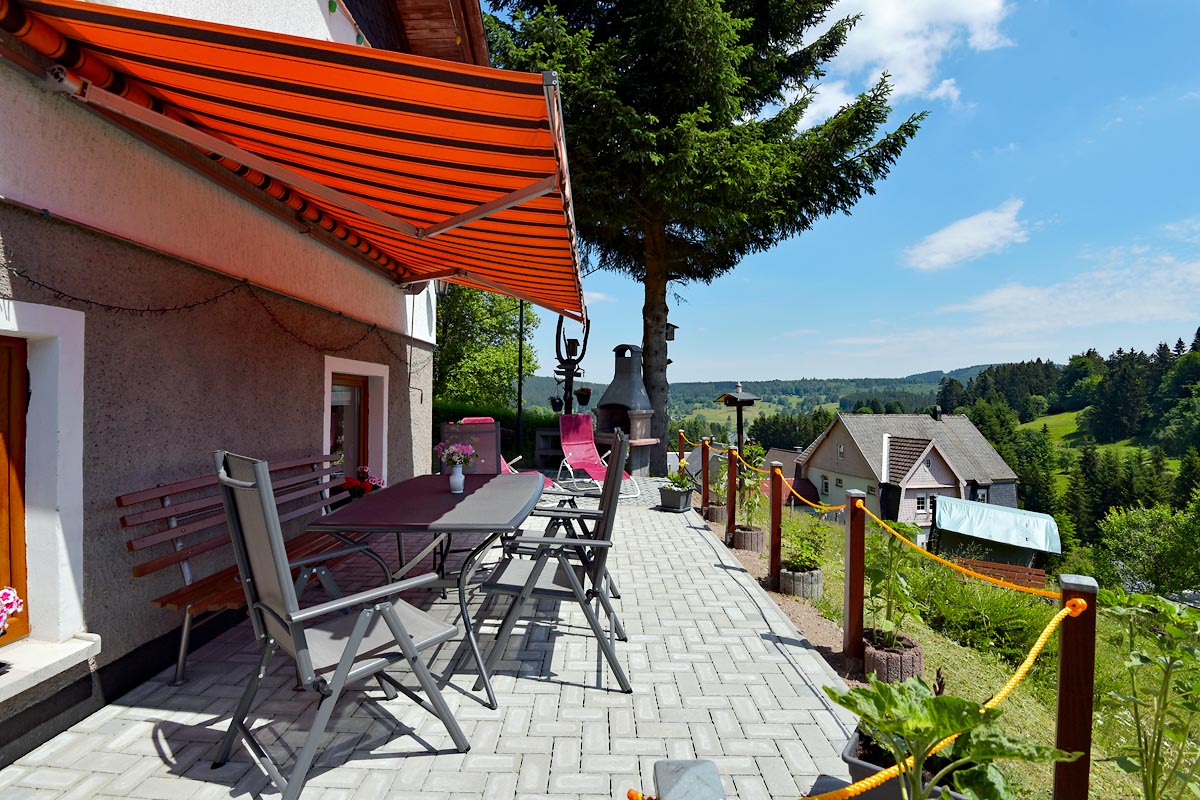 Unser gemütlich eingerichtetes Ferienhaus mit Panoramablick liegt am Waldrand und hat einen direkten Zugang zum Wanderwege- und Loipennetz des Rennsteiggebietes.