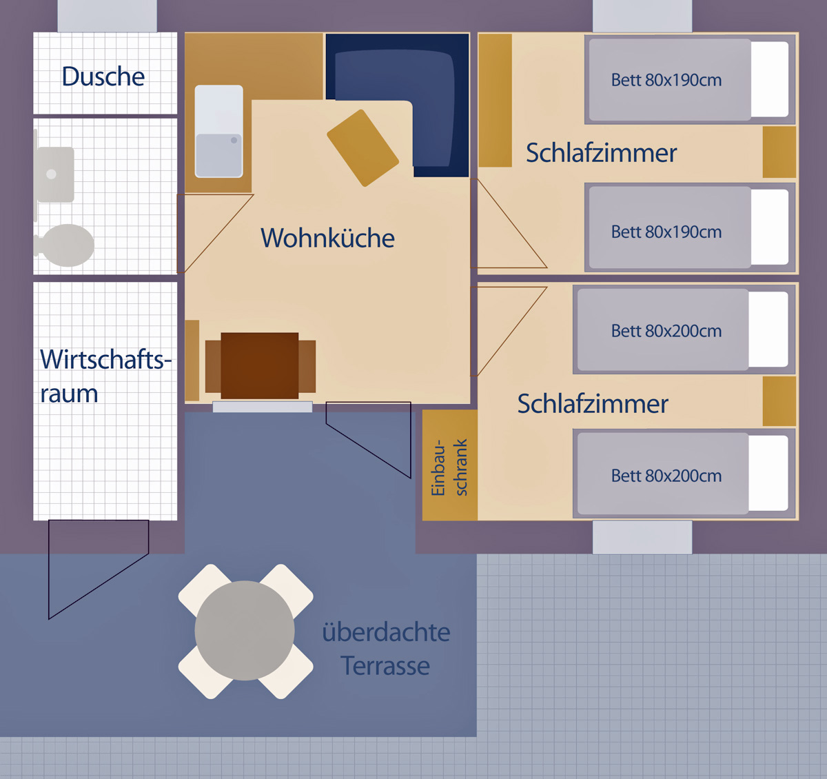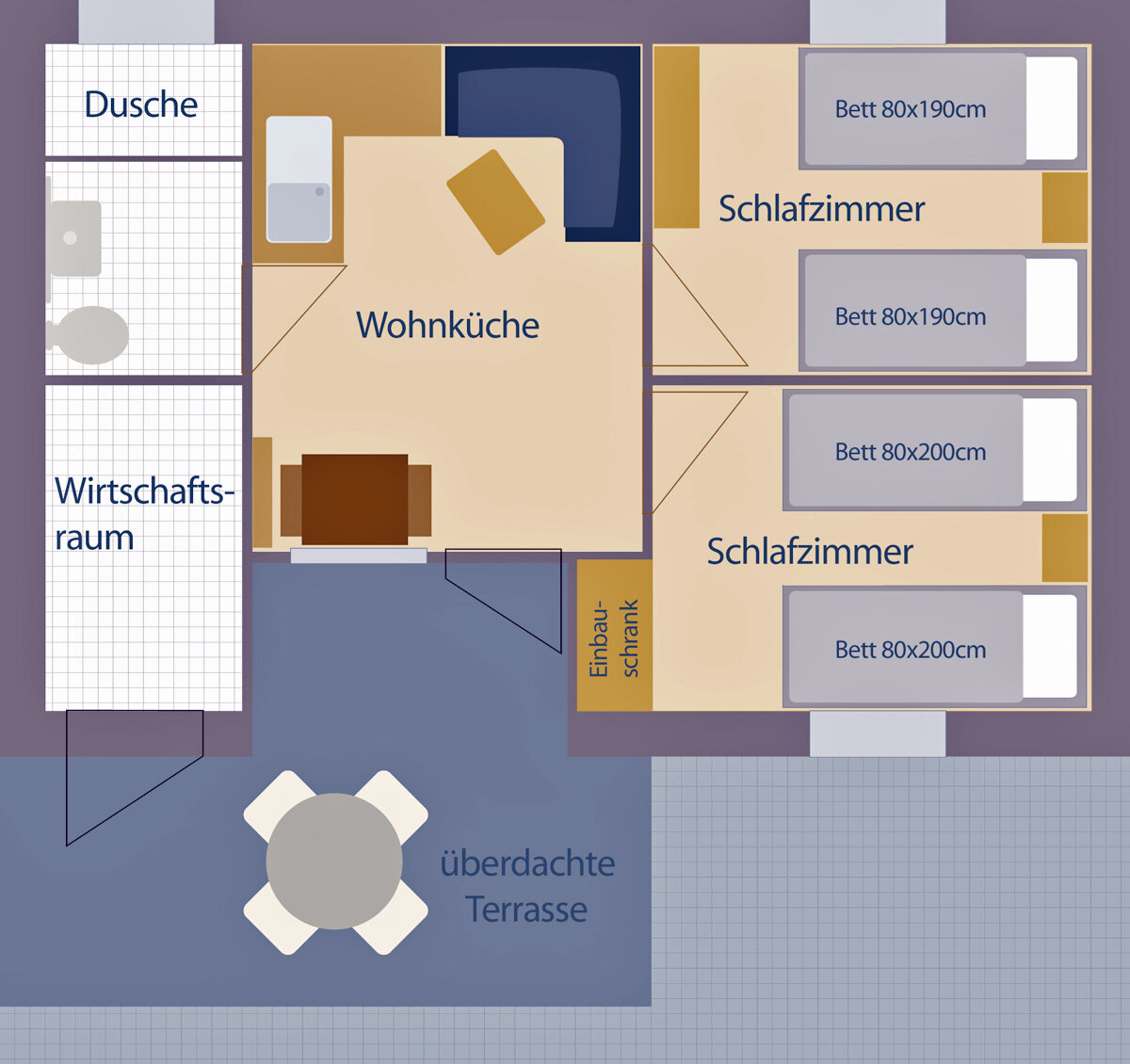 Es erwartet Sie ein geschmackvoll eingerichteter Bungalow mit Platz für 4 Personen. In der Vor- und Nachsaison ist der Bungalow beheizbar.
