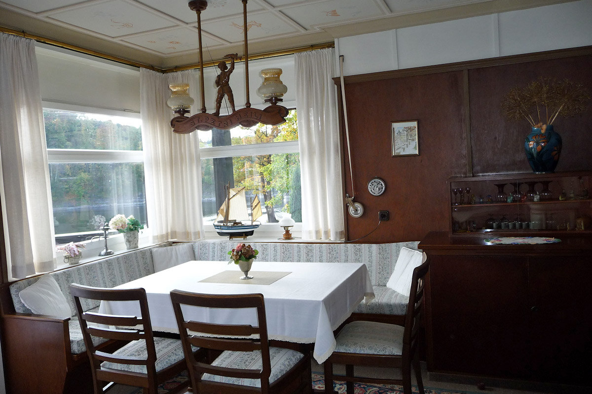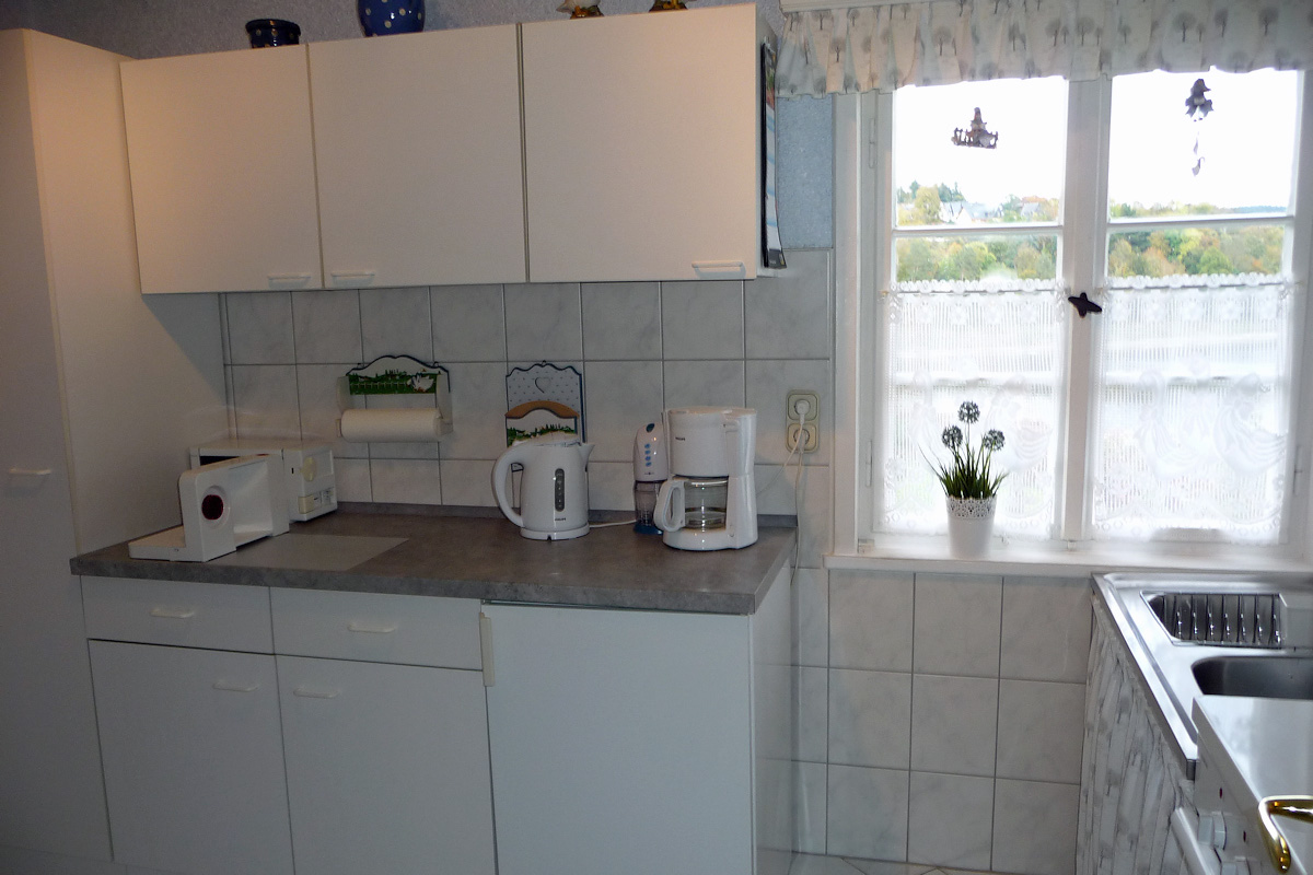 Von hier gelangen Sie in das Wohnzimmer, welches Dank holzvertäfelter Wände und schöner antiker Möbel seinen ganz eigenen Charme ausstrahlt. Ein großer Esstisch, bequeme Sitzmöbel ein Holzofen und TV bzw. Radio stehen zu Ihrer Verfügung. Vom Wohnzimmer gelangen Sie in die gut ausgestattete Küche mit eingebauter Duschecke. Ein separates WC ist ebenfalls vom Flur zugänglich. Im Obergeschoß befindet sich Ihr Schlafzimmer. Einbauschränke bieten ausreichend Platz für Ihre Kleidung und ein zusätzliches Waschbecken gehört zur Ausstattung.