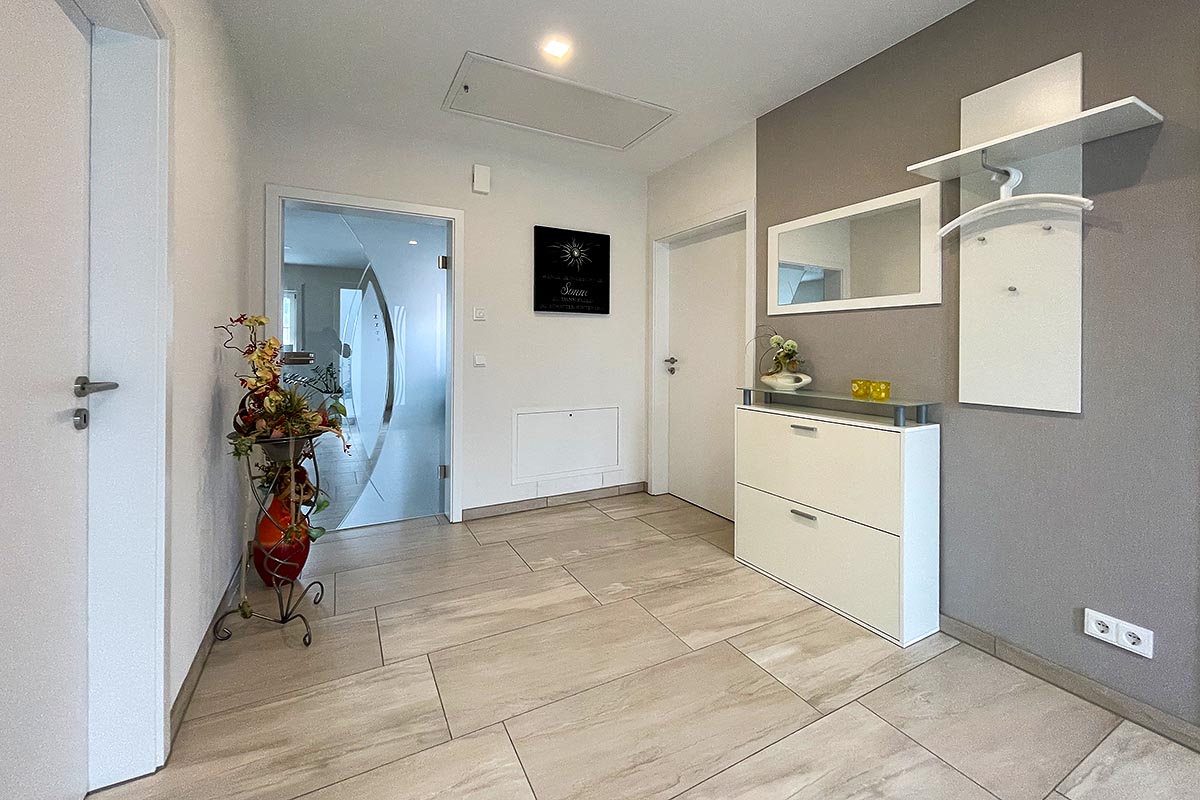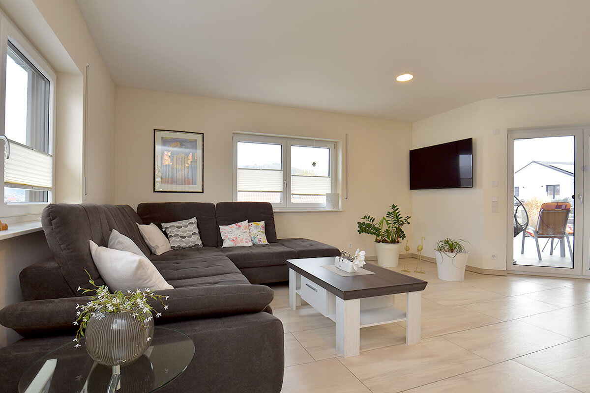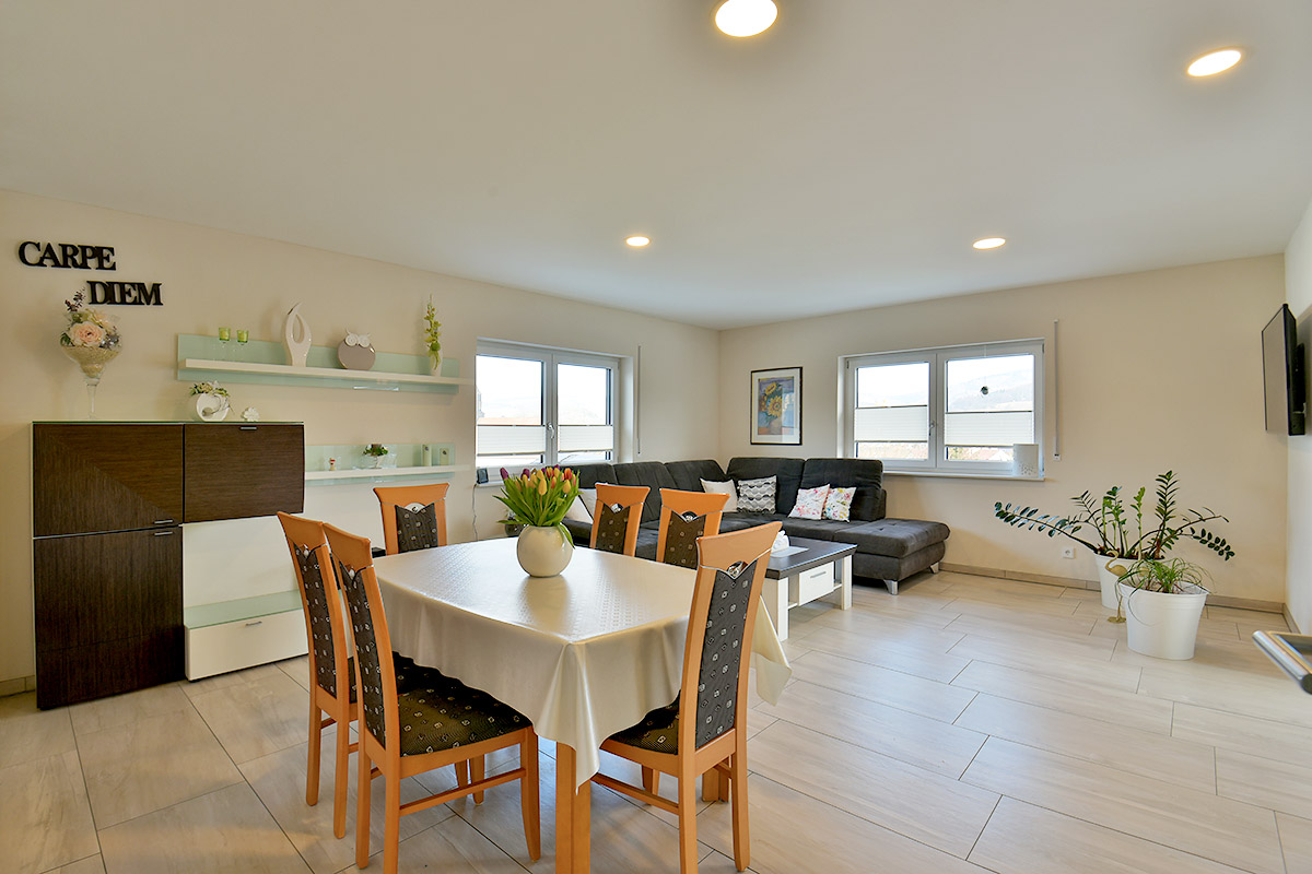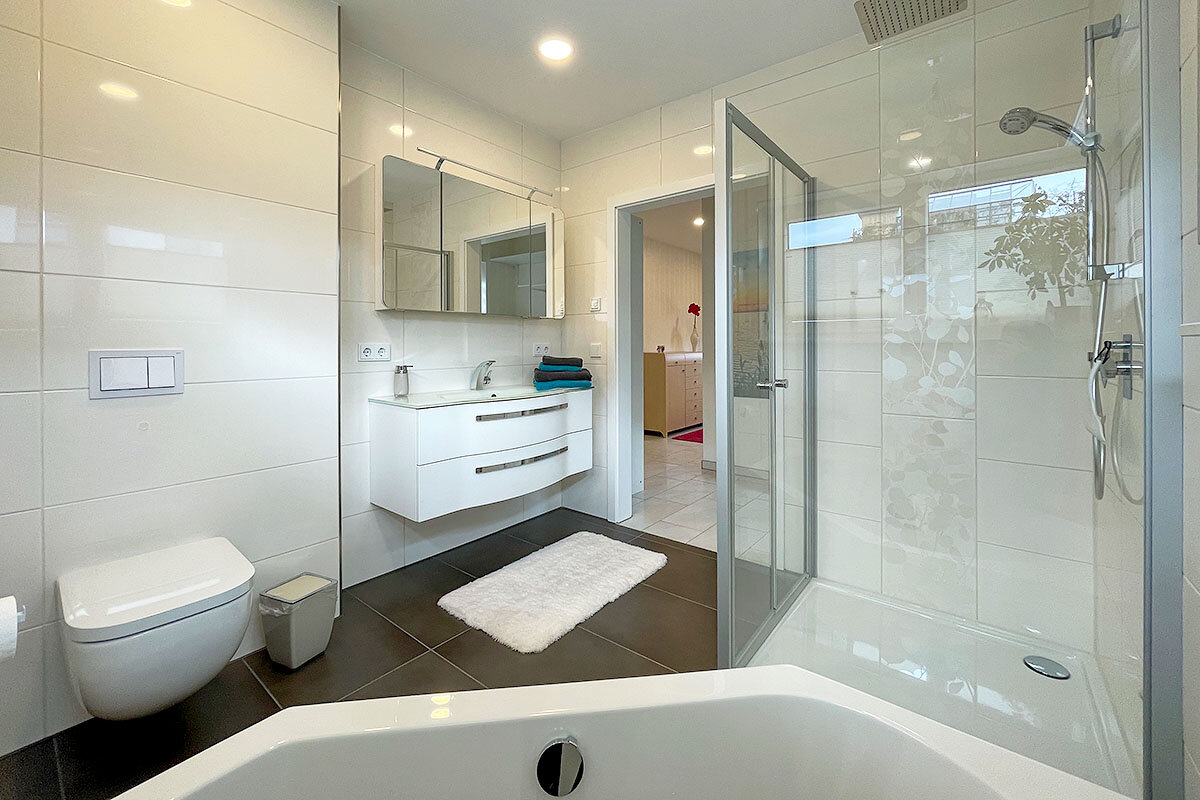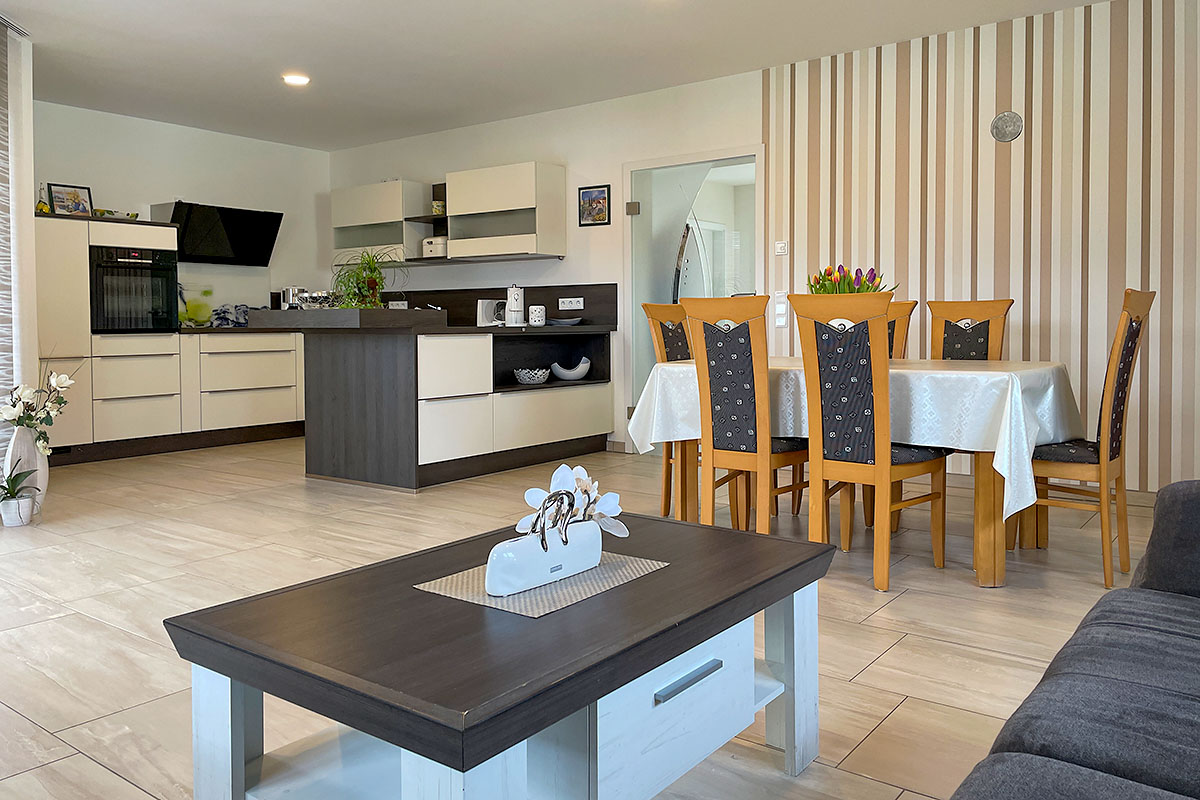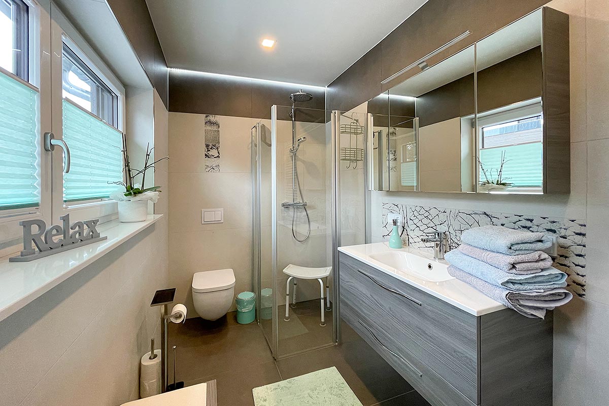 Es bietet Platz für 4 bis 5 Personen und verfügt über ein Schlafzimmer mit Doppelbett und der Möglichkeit der Aufbettung (Kinderreisebett), ein separates Badezimmer mit Dusche und Badewanne, ein helles Wohnzimmer (inkl. Schlafsofa) mit Essbereich und offener, sehr gut ausgestatteter Küche sowie einem weiteren Gästebad mit Dusche.