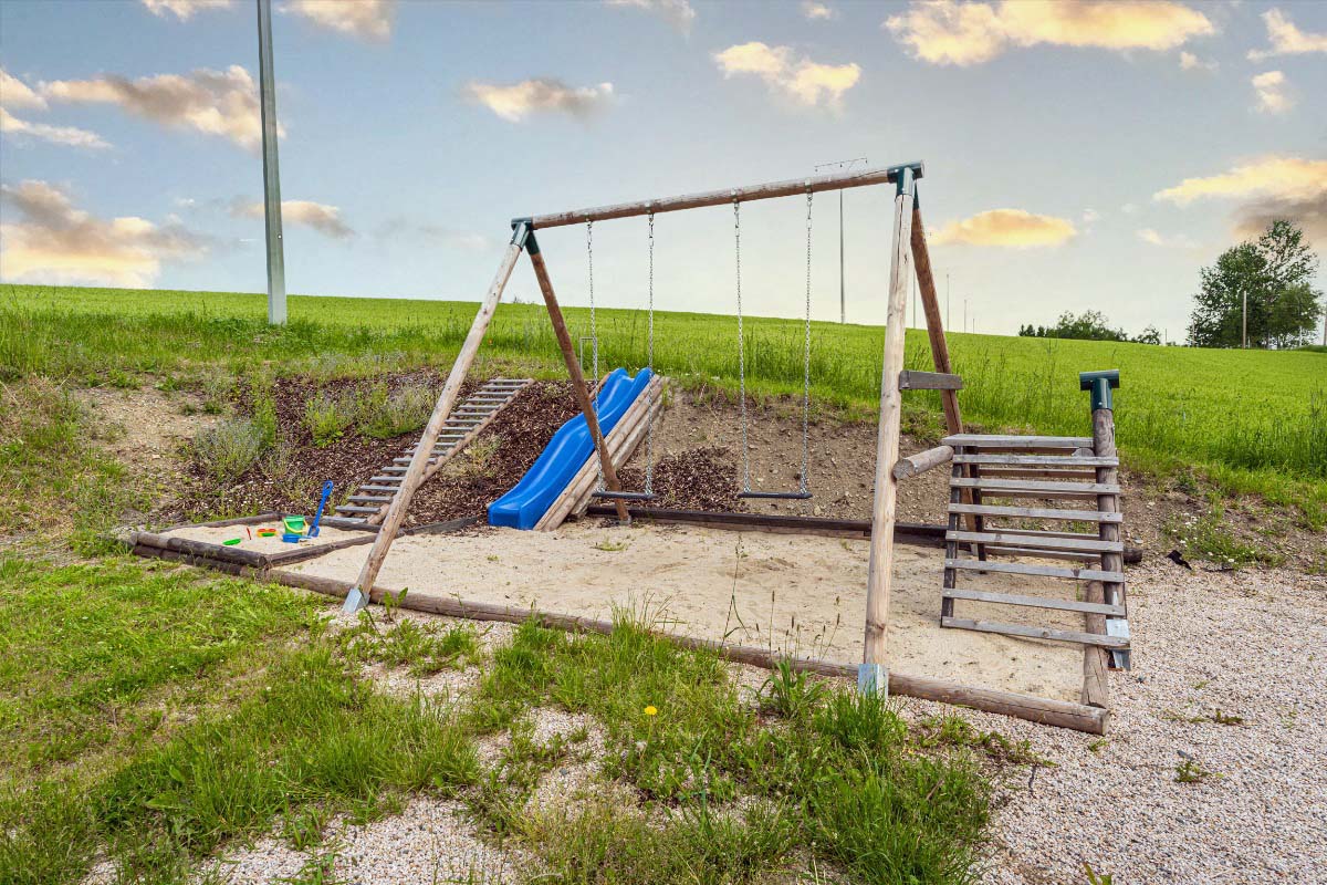 Eine große Außenanlage mit Spielplatz und einer teilweise überdachten Gartenterrasse laden zum Sonnen, Entspannen oder auch zum Grillen ein.