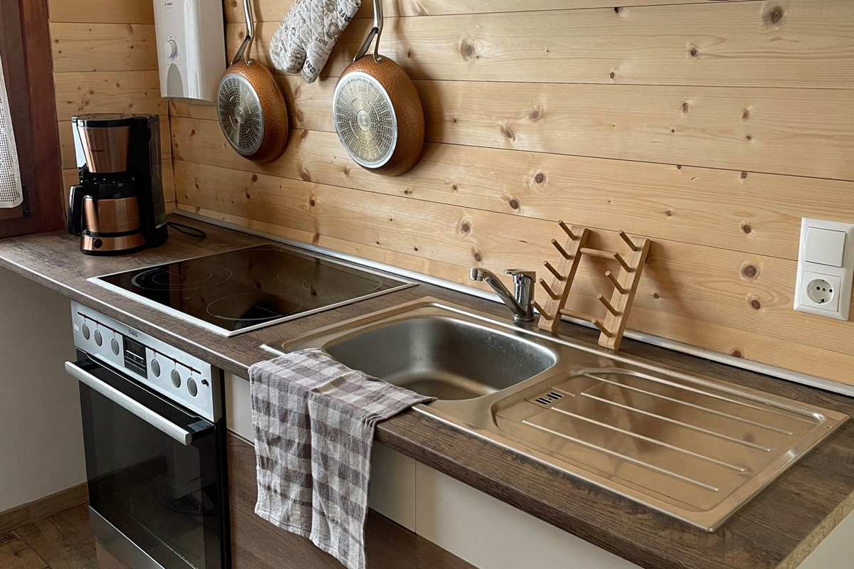 Die Küche ist mit Backofen/Herd, Kühlschrank und Gefrierfach, Wasserkocher, Mikrowelle und Küchenutensilien (Töpfe; Pfannen; ausreichend Geschirr usw.), Toaster sowie Kaffeemaschine voll ausgestattet. Das Badezimmer mit WC und Dusche befindet sich im Erdgeschoss.