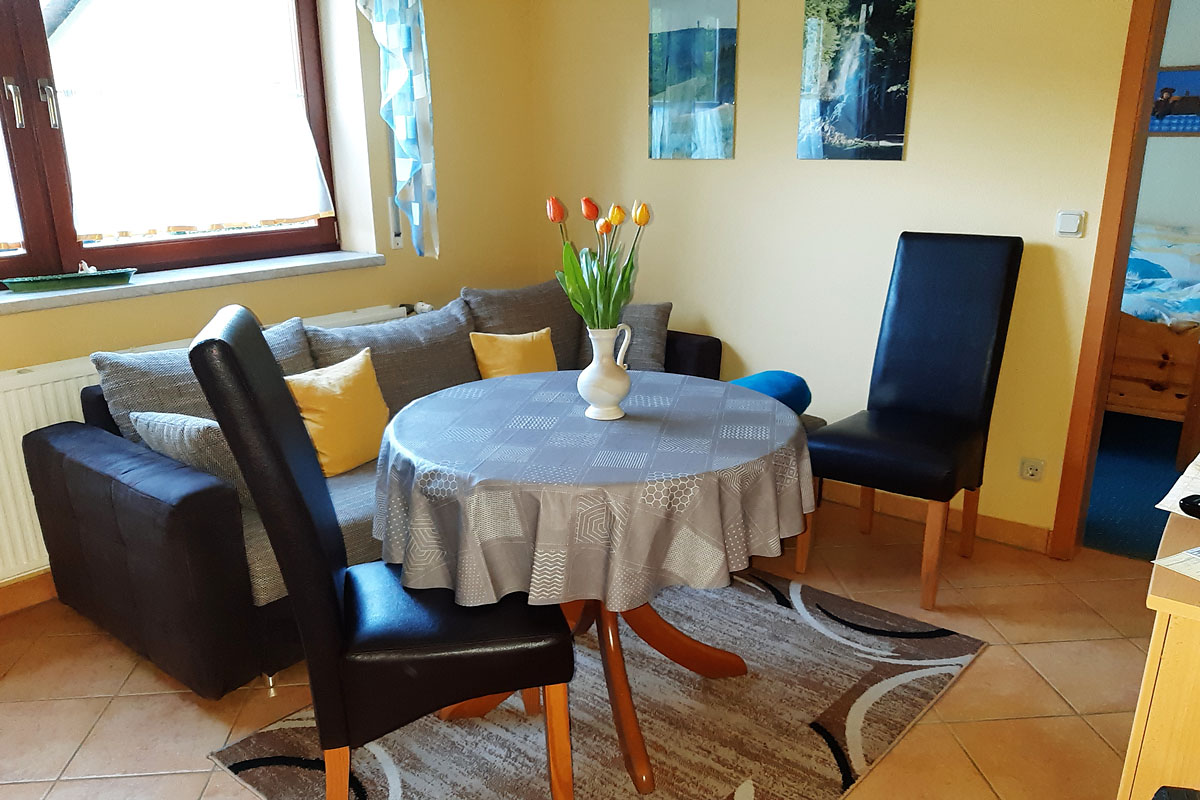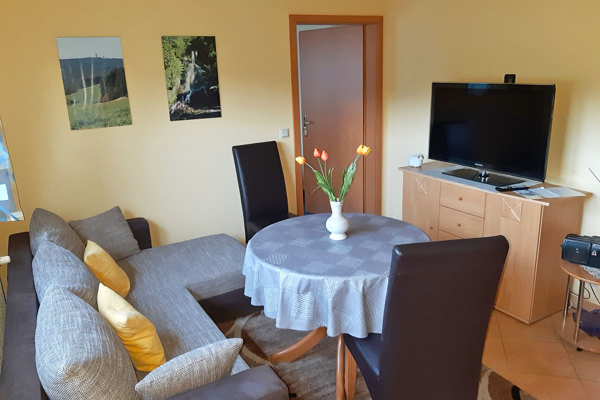 Unsere neu eingerichtete Ferienwohnung (34 qm) liegt in ruhiger Lage am Ortrand von Laudenbach, ein Ortsteil von Trusetal.