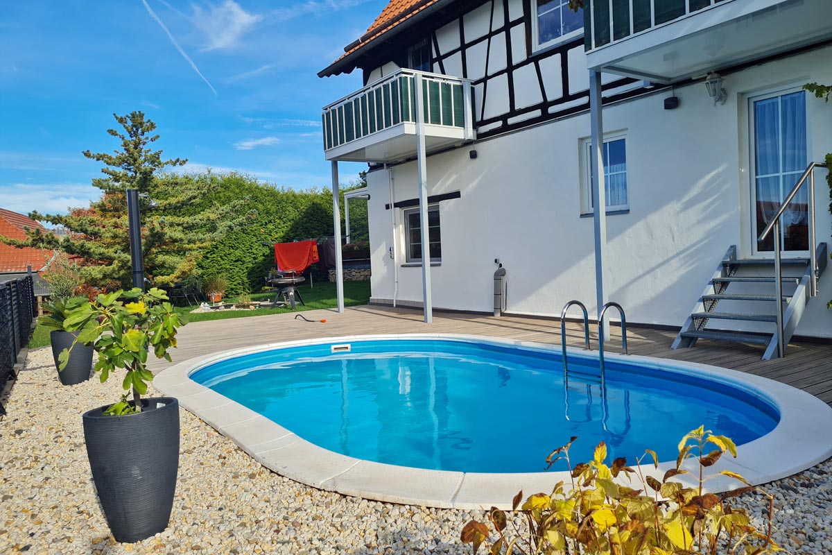 Die Ferienwohnung und das Gästezimmer befinden sich in einem separaten, liebevoll sanierten Fachwerkhaus auf unserem Grundstück. Geniessen Sie von Ihrem Balkon den Blick ins Grüne. Ein kleiner Pool im Gartenbereich lädt zum Abkühlen ein.
