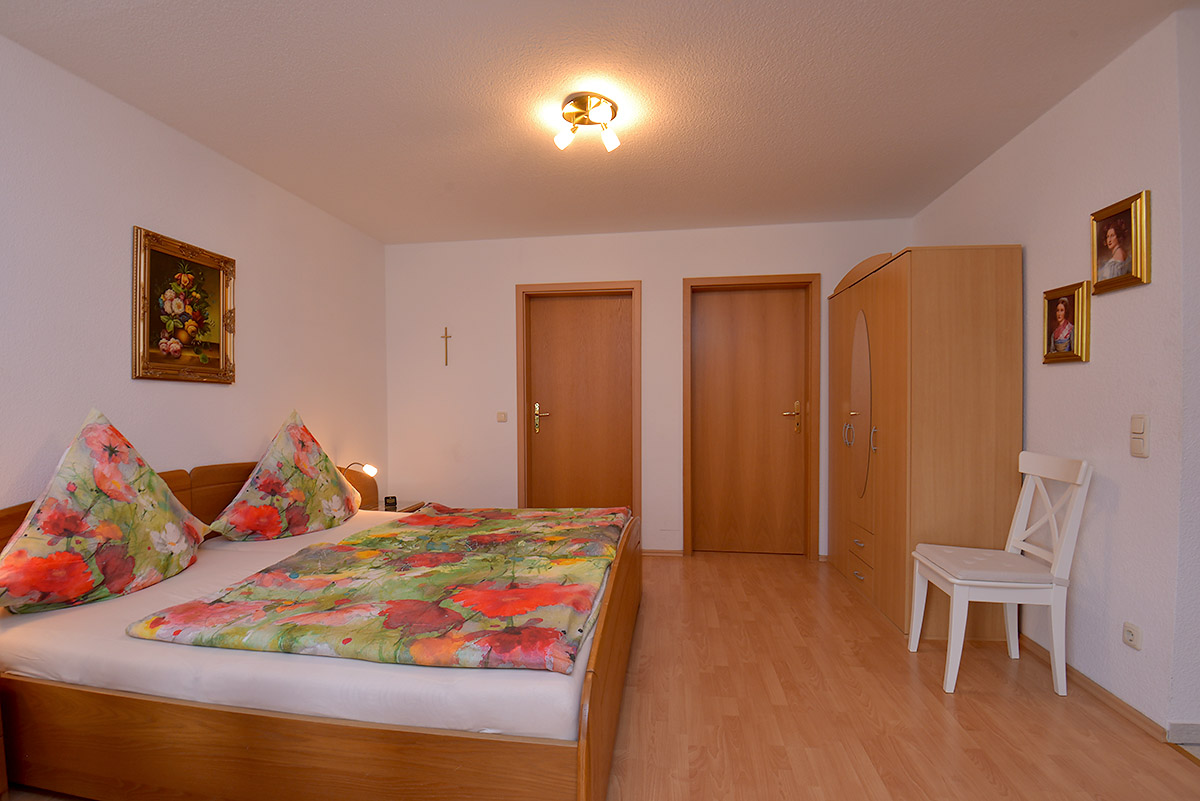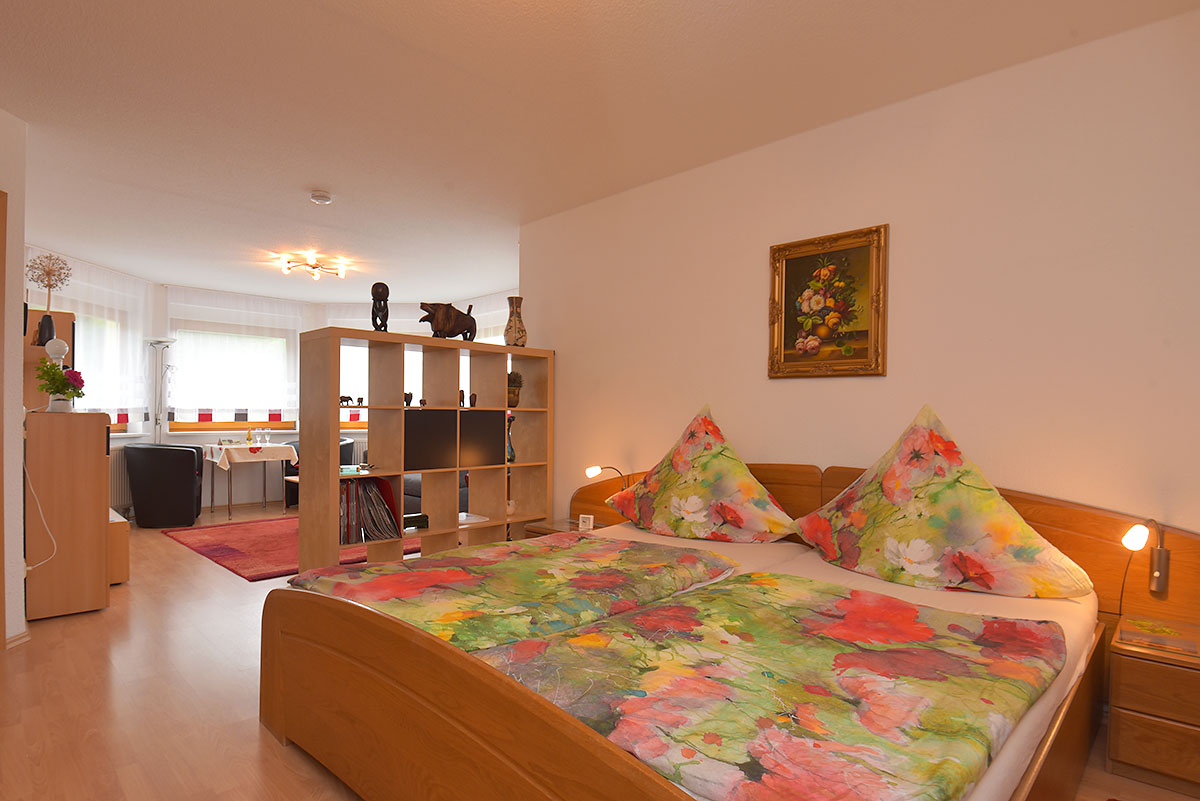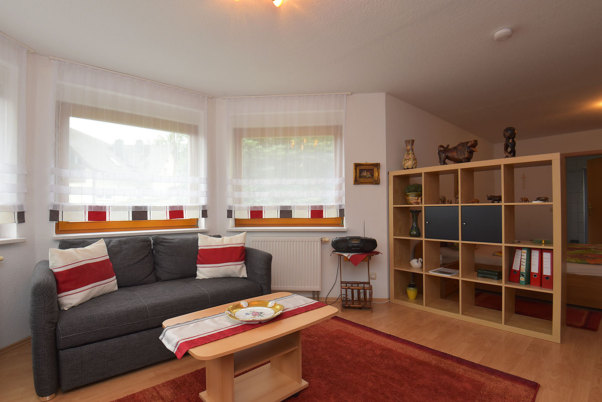 Das Wohnzimmer ist mit einem Raumteiler in Wohn- und Schlafbereich unterteilt. Ein großzügiges Doppelbett 2,00 x 2,00 Meter groß und einen Kleiderschrank sowie Nachtschränkchen mit Leselampen gehören zur Ausstattung des Schlafbereiches. Im Wohnbereich, der durch einen achteckigen Erkeranbau einen besonderen Charme vermittelt, erwarten Sie eine Anbauwand, LCD-Fernseher und CD-Radio sowie eine ausziehbare Schlafcouch mit Tisch. Für eine fünfte Person können wir ein Reisebett aufstellen. Zwei gemütliche Sessel und ein Esstisch komplettieren unser Angebot.