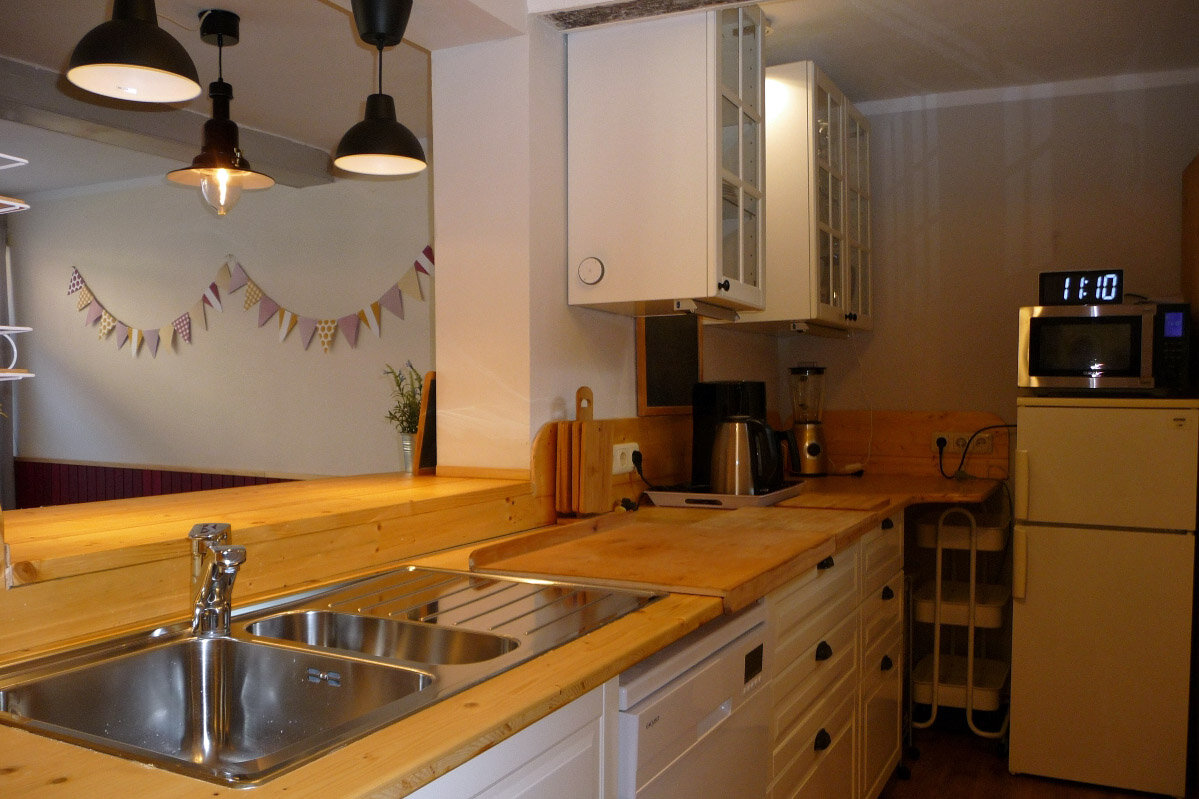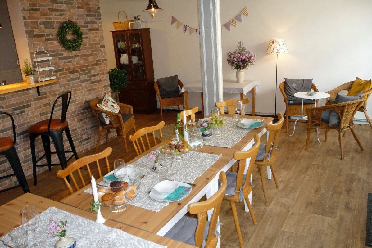 Der Nichtraucherraum eignet sich besonders für kleine Feiern und Treffen von maximal 20 Personen und kann in Ergänzung zu der Ferienwohnung, aber auch allein gemietet werden. Er ist vom Innenhof und von der Straße aus zu erreichen, so dass Lebensmittel und Getränke direkt vom Auto aus hineingetragen werden können. Der gemütliche 40 qm große Gastraum bietet eine variable Gestaltung der Tische an, so dass sowohl eine lange Tafel mit zusätzlichem Buffet, als auch eine aufgelockerte Caféatmosphäre möglich ist. Eine Bar mit Stühlen eröffnet den Blick in die dazugehörige Küche. Diese ist mit allem Geschirr und modernen Geräten ausgestattet, dass eine unbeschwerte Feier möglich ist. Zugehörig zum Feierraum ist ein Flur mit Garderobe und eine Toilette, welche beide zum Innenhof hin liegen. An Sommertagen kann auch der Innenhof genutzt werden.