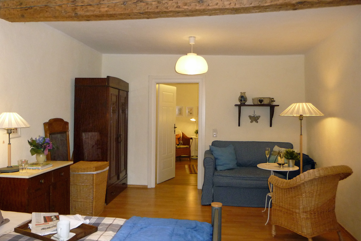 Dicke Lehmwände schenken der Wohnung im Sommer angenehme Kühle und im Winter behagliche Wärme. Die großzügige 76 qm große Nichtraucherwohnung ist über den Innenhof mit einem separaten Eingang zu erreichen und befindet sich im Erdgeschoß.