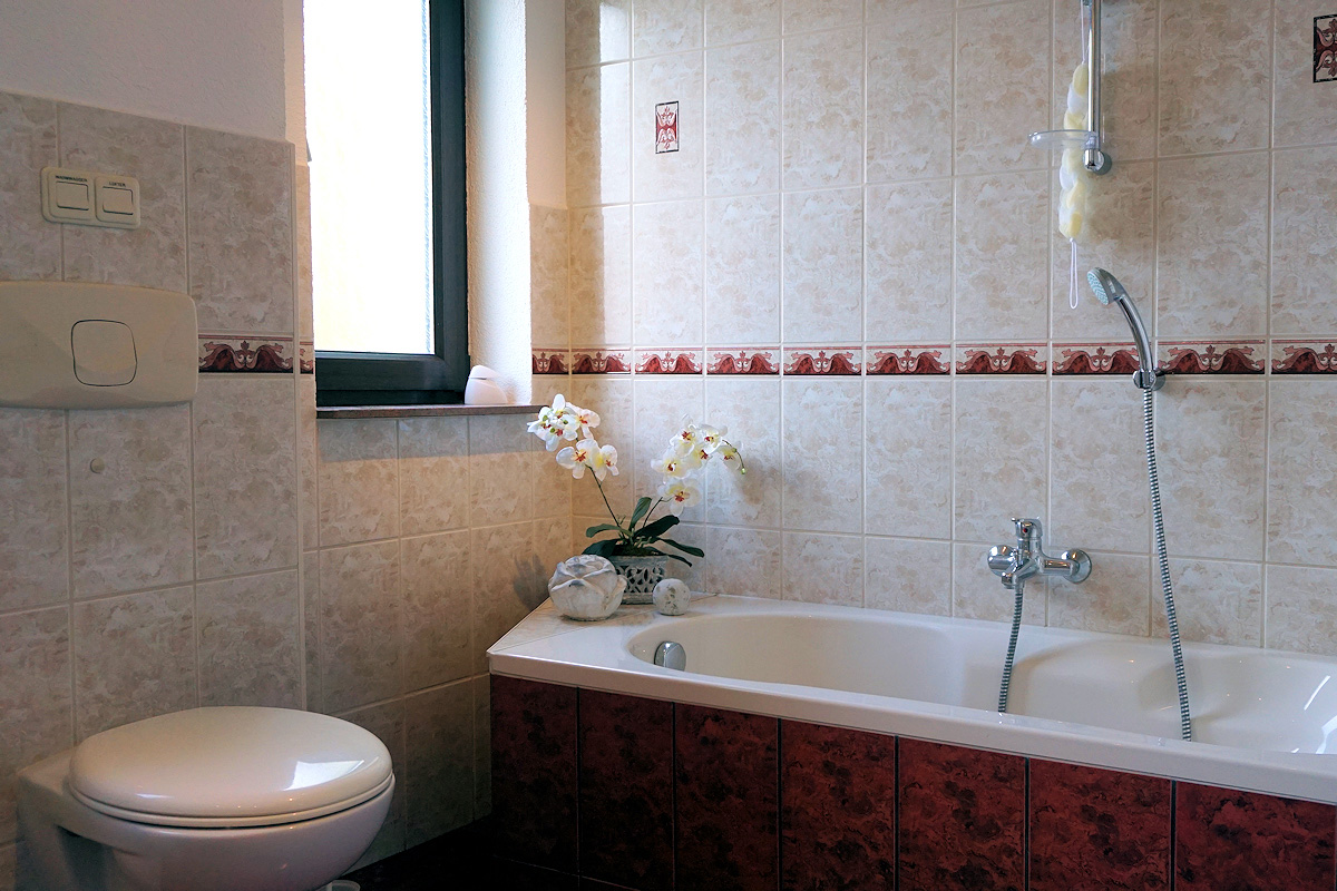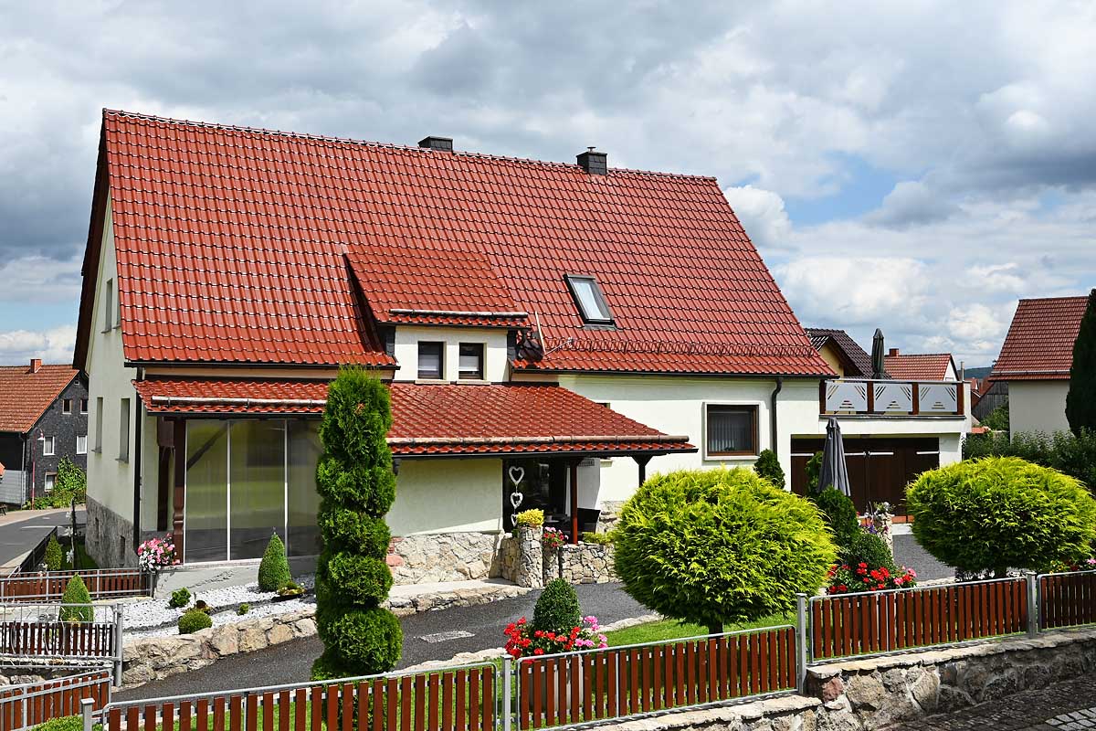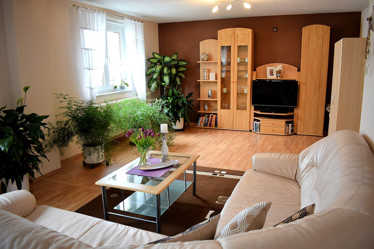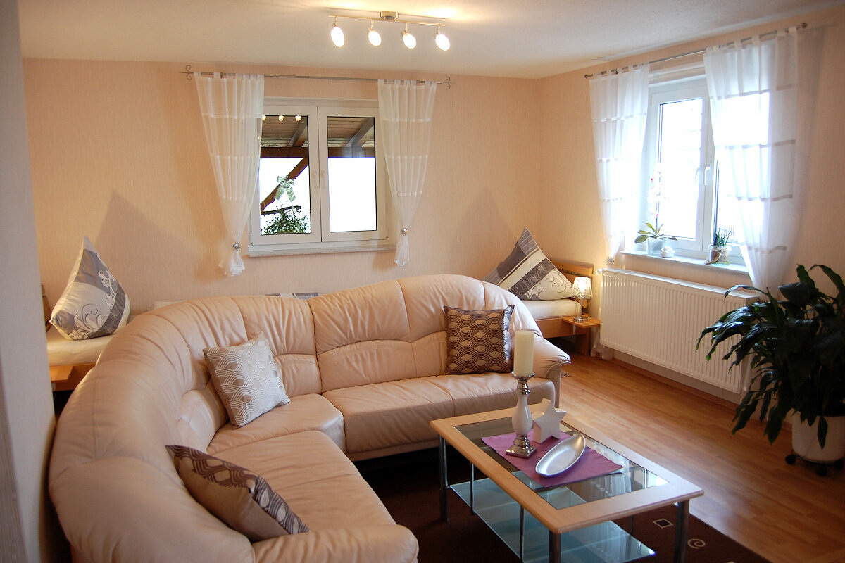 Unsere komfortabel eingerichtete Nichtraucher-Ferienwohnung (je Bedarf 60 oder 90 qm, separater Eingang) bietet ausreichend Platz für 5 Personen und befindet sich im Erdgeschoss unseres Wohnhauses. Die Ferienwohnung verfügt über ein Bad mit WC und Badewanne (als Duschmöglichkeit), eine modern eingerichtete Wohnküche, ein Schlafzimmer mit Doppelbett und ein großzügiges Wohnzimmer (2 Einzelbetten), ein separates kleines Wohnzimmer mit Doppelbettcouch, sowie ein Zimmer mit Einzelbett.