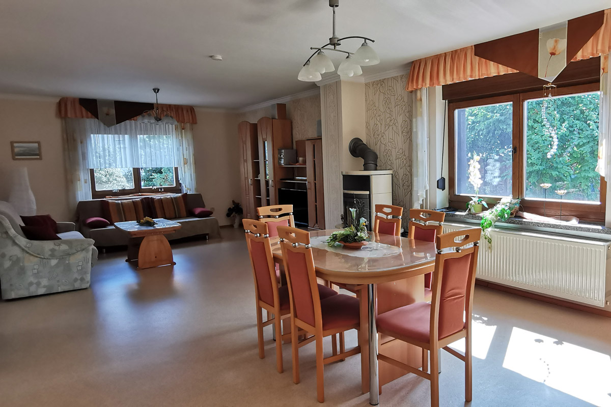 Unsere komfortabel ausgestattete Nichtraucher-Ferienwohnung für bis zu 6 Personen (Aufbettung möglich), befindet sich in ruhiger Ortslage von Borsch (Ortsrand, kein Verkehr), nahe dem Rhönstädtchen Geisa. Borsch liegt direkt am Ulstertal-Radweg.