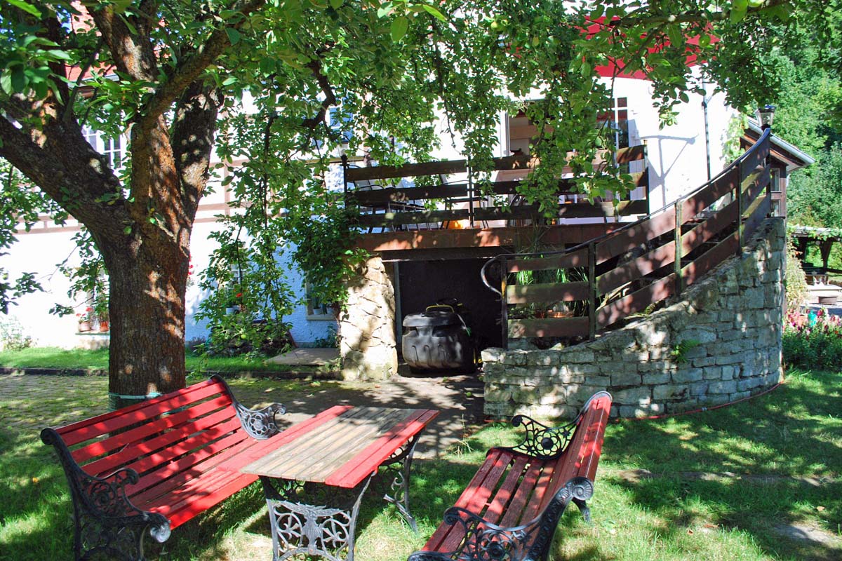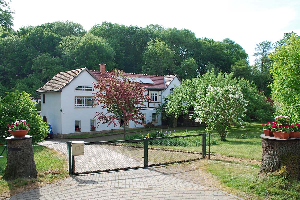 Auf einem 8700 m² großen Grundstück am Ortsrand von Ballstädt, direkt am Wald, befindet sich das im Jahr 2013 gebaute Appartement mit separatem Eingang als Einliegerwohnung in der freistehenden ehemaligen Obermühle.
