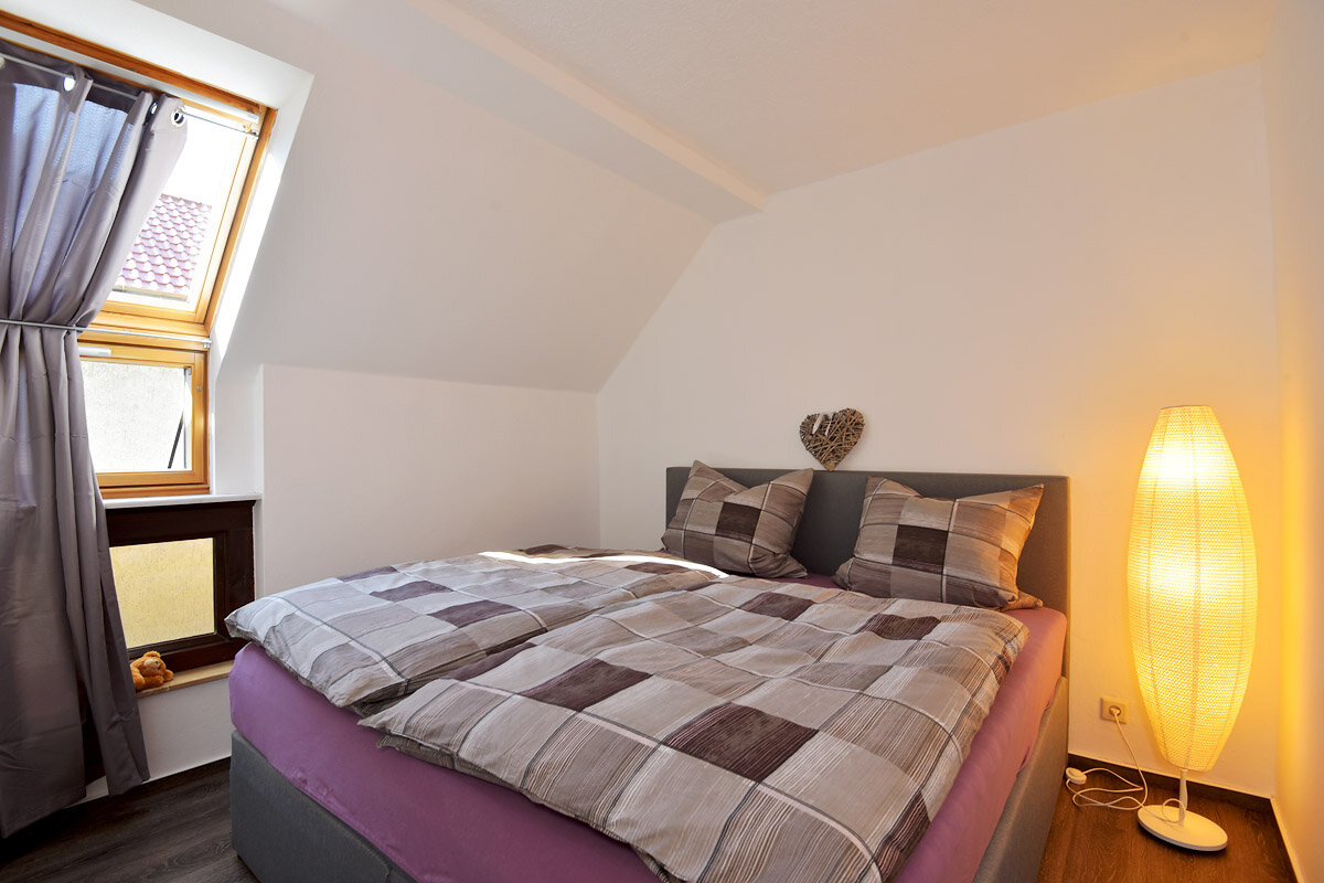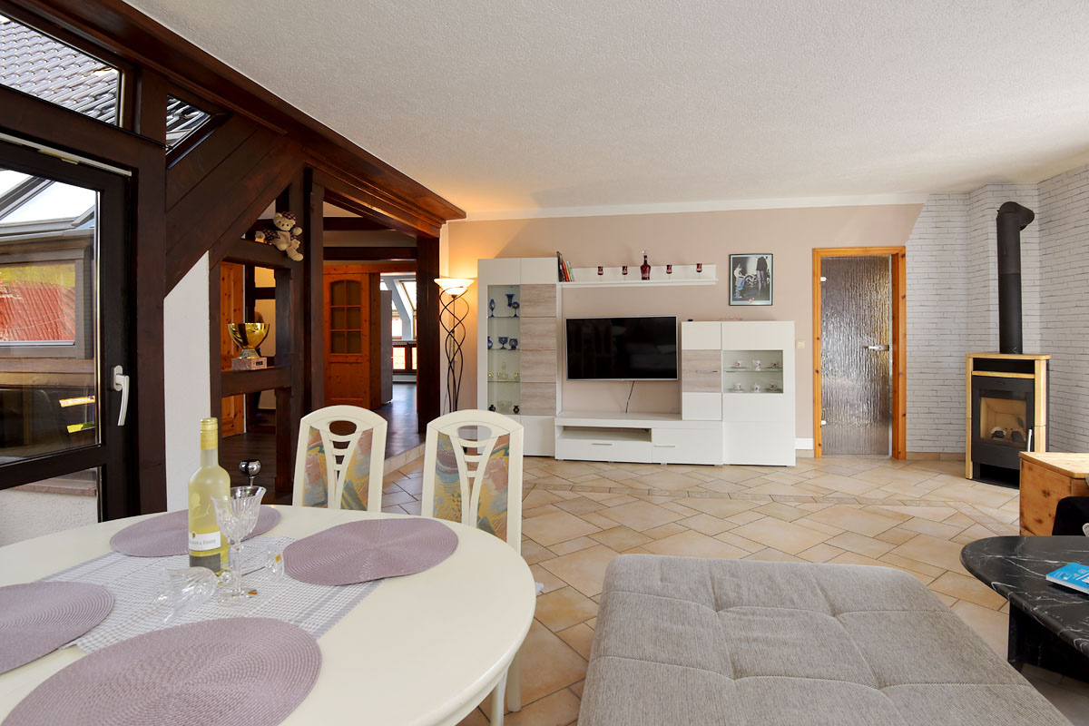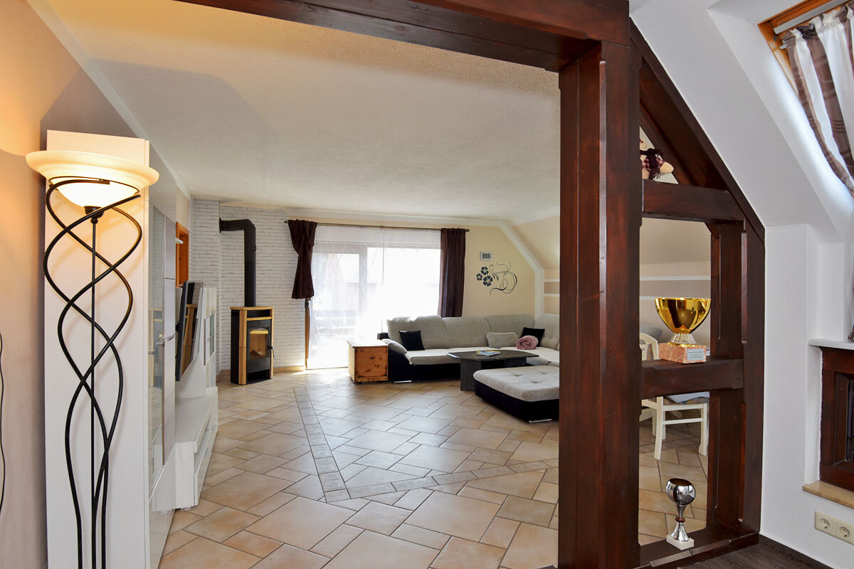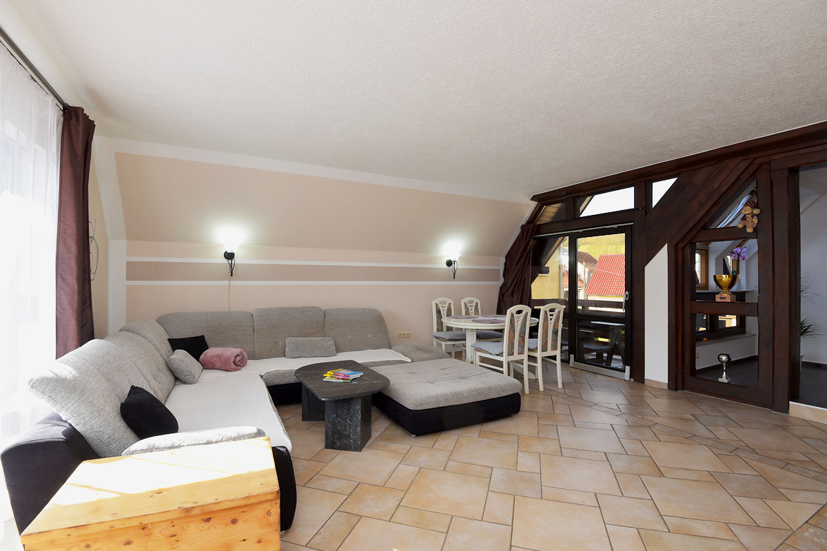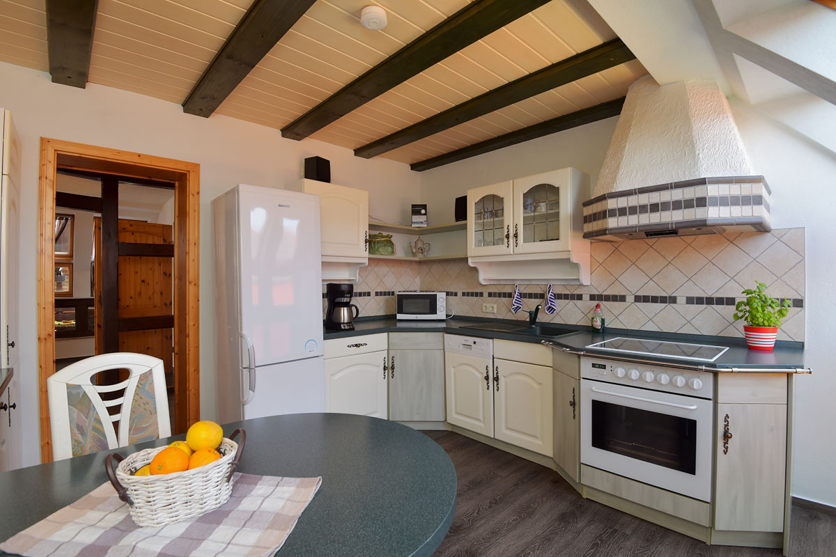 Unsere Ferienwohnung für 4 Personen mit Holzbalken und großen, hellen Räumen befindet sich im 1. Obergeschoss. Zur Wohnung gehören zwei separate Balkone, die zum Relaxen einladen.
