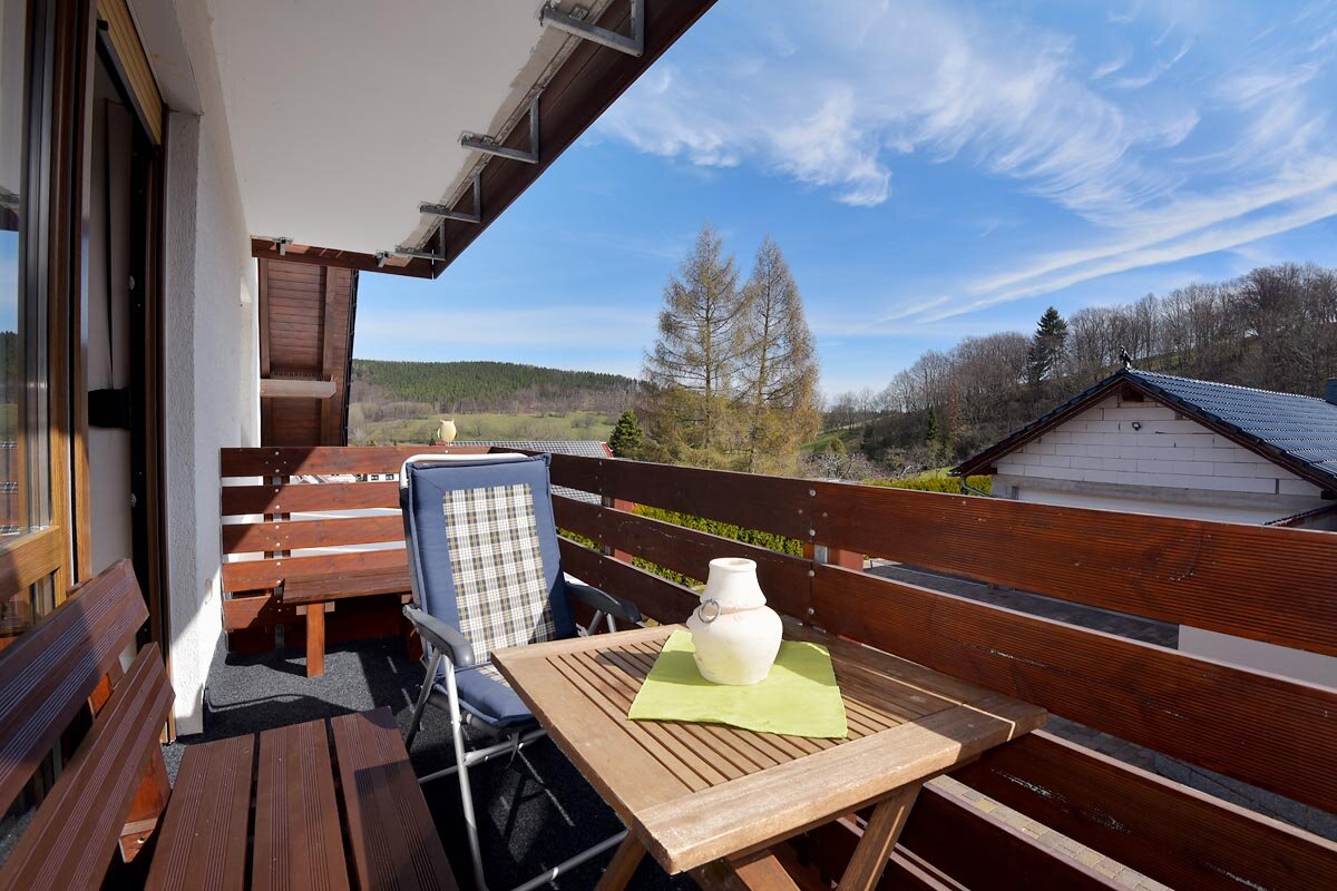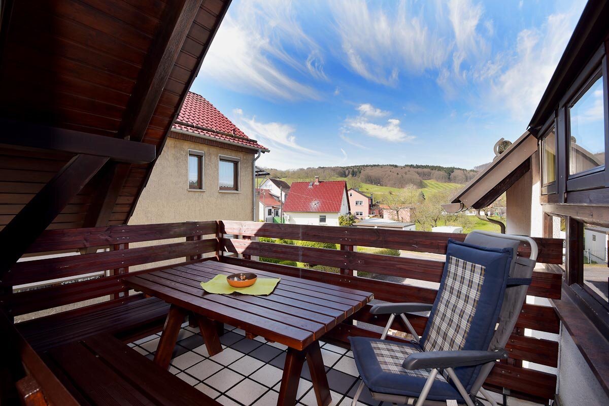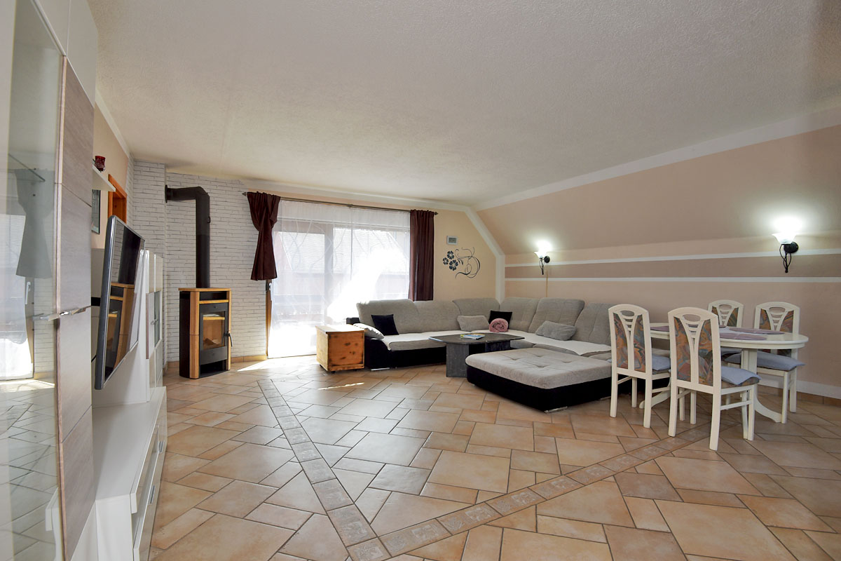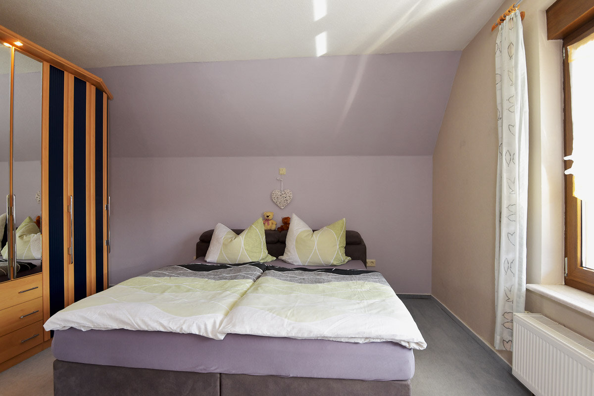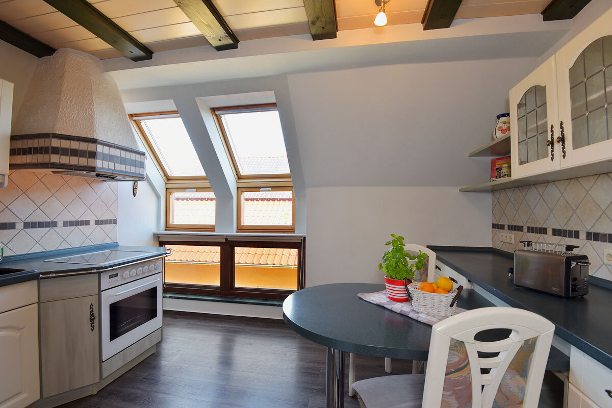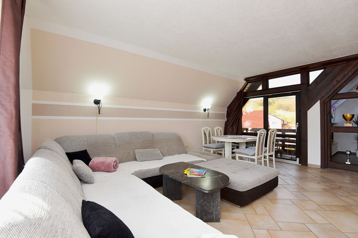 Unsere Ferienwohnung für 4 Personen mit Holzbalken und großen, hellen Räumen befindet sich im 1. Obergeschoss. Zur Wohnung gehören zwei separate Balkone, die zum Relaxen einladen.