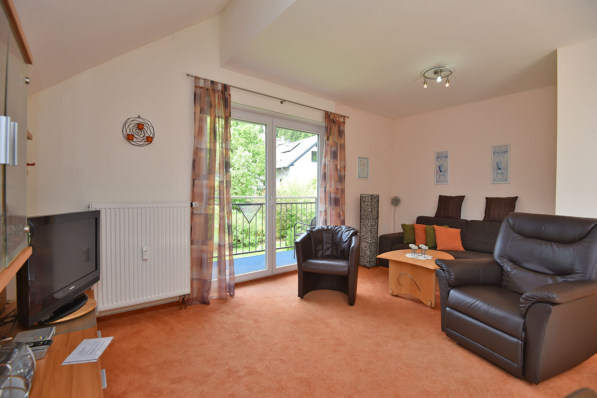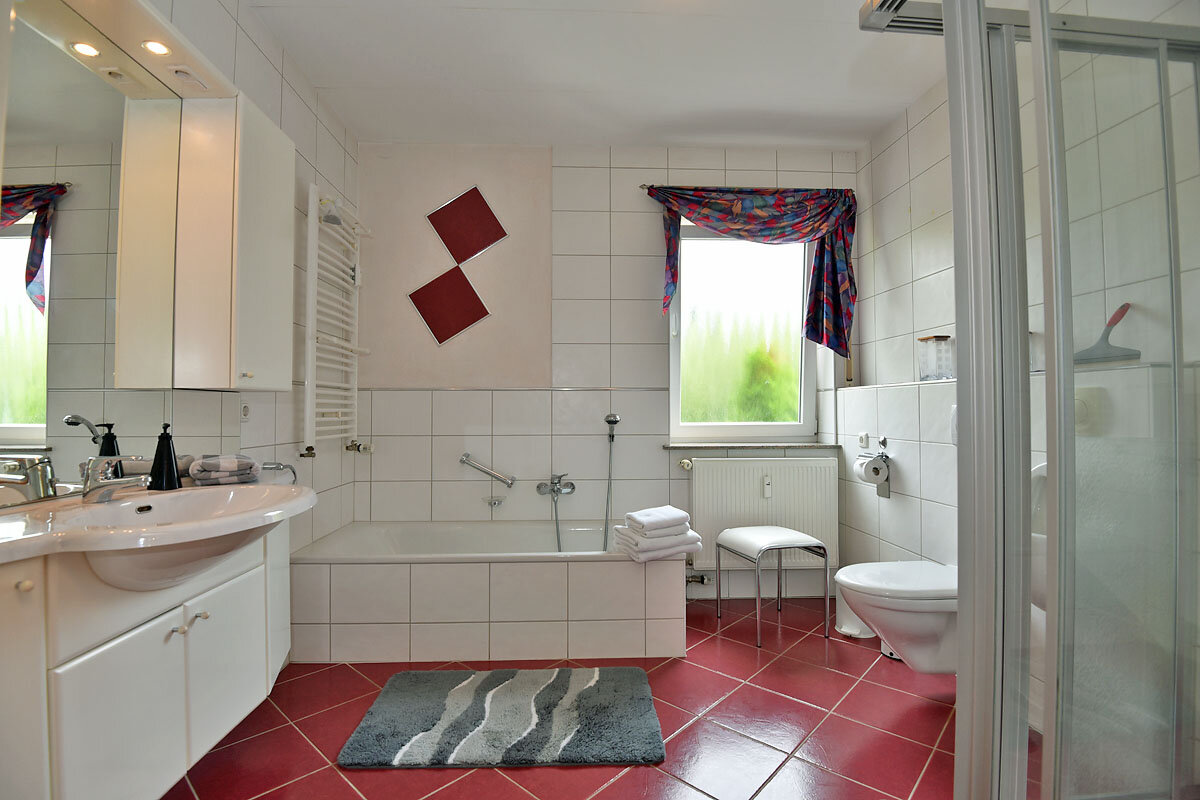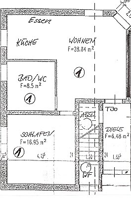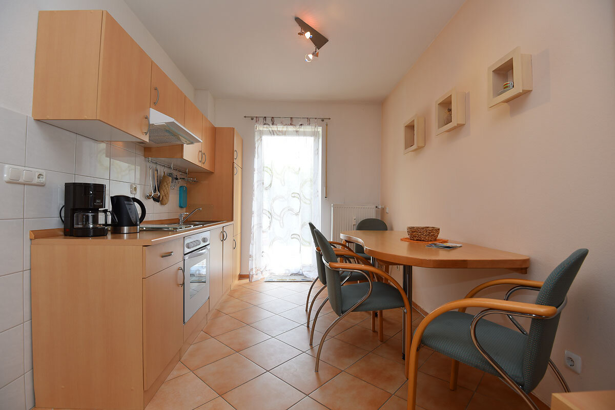 Die Ferienwohnung im Erdgeschoss (60 qm) für 2 bis 5 Personen (behindertengerechte Fewo) verfügt über einen Wohn-Schlafraum (Radio, TV, Video), einen Schlafraum, Essbereich mit komplett ausgestatteter Küche (die bis hin zu Kaffeemaschine, Toaster und Mikrowelle alles beinhaltet), Bad mit Fußbodenheizung, Badewanne, Dusche, WC, Urinal.
