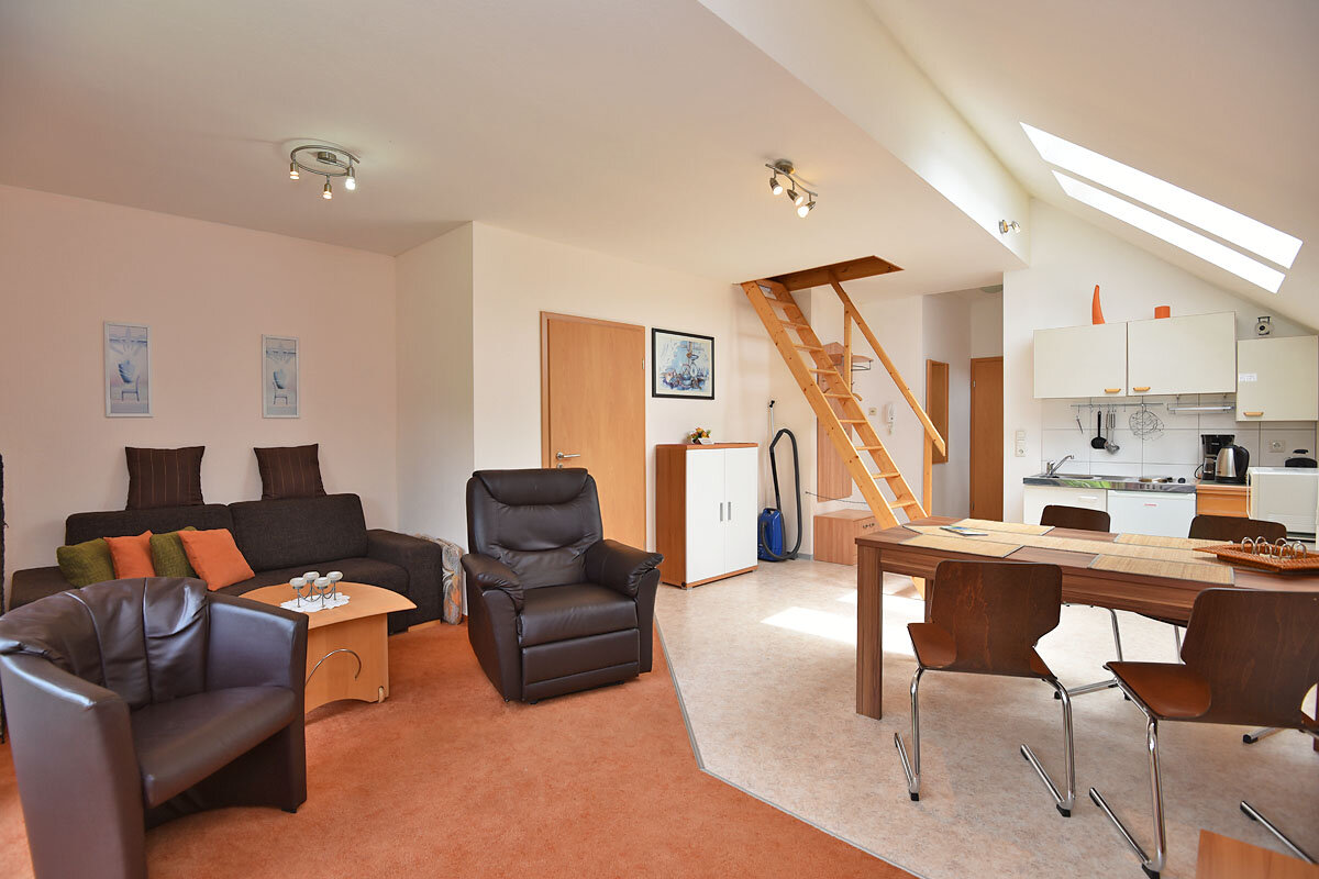 Die Ferienwohnung im Dachgeschoss (45 qm) für 2 bis 4 Personen mit Wohn/Schlafraum (Radio, TV, Video), einem Schlafzimmer, Kochzeile mit Essbereich, Bad mit Dusche und WC.