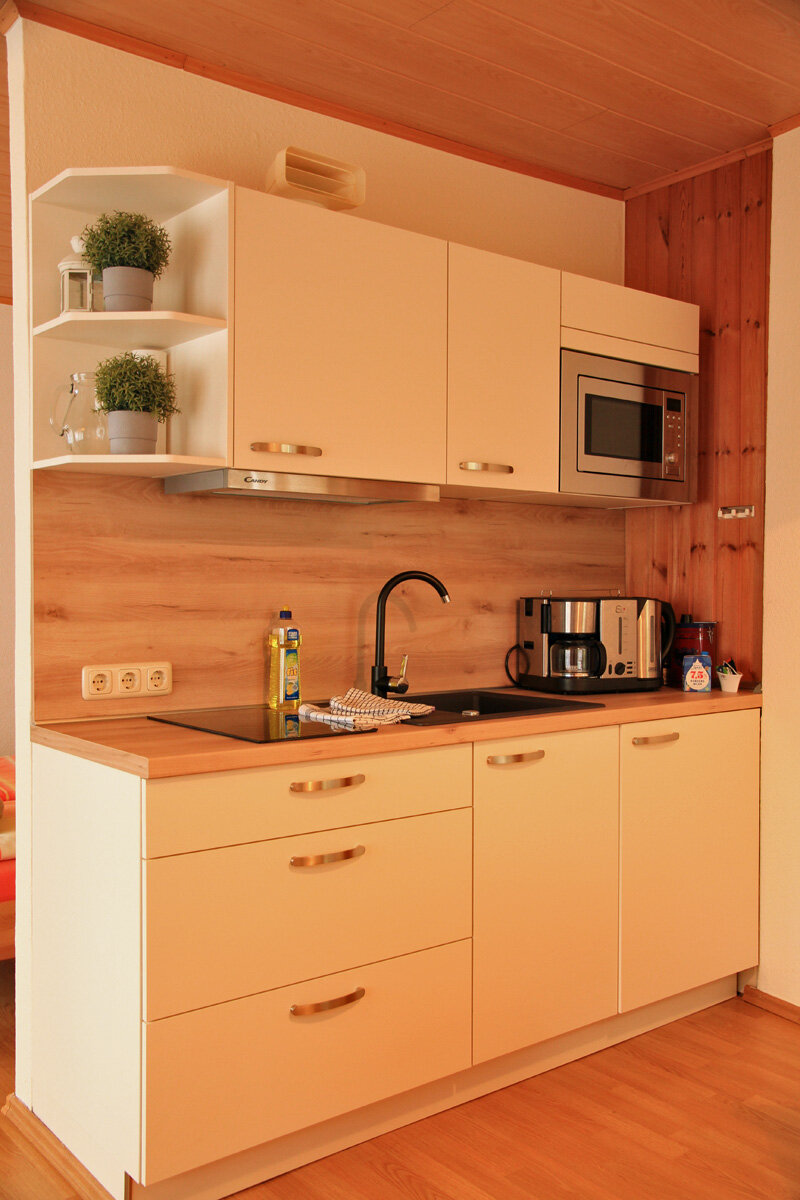 Der große Wohnraum unterteilt sich in Wohn- und Kochbereich mit Küchenzeile. Die Küchzeile ist ausgestattet mit Wasserkocher, Kaffeemaschine, Mikrowelle, Toaster, Induktionsherd mit Abzugshaube, Brotschneidemaschine sowie ausreichend Geschirr, Besteck und Gläser.