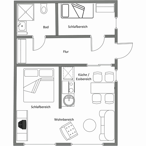 Der Schlafbereich ist optisch vom Wohnbereich durch einen modernen Schiebevorhang unterteilt. Ein modernes Bad mit Dusche, Waschbecken, Fön und einem separat abgeteilten WC runden unser Angebot ab.