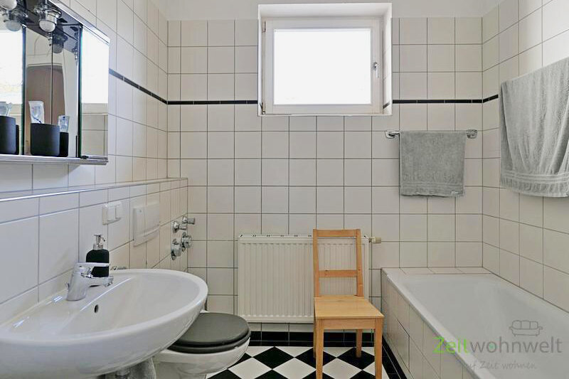 Küche und Bad sind modern gefliest und bieten allen Komfort der eigenen Wohnung. Das Bad besticht durch seine Größe und sowohl Badewanne und Duschkabine. In der Küche können Sie sich mit einem hochwertigem Herd und umfangreichen Kücheninterieur wie zu Hause fühlen und mit Blick auf den Laubengang gemütlich aufhalten.