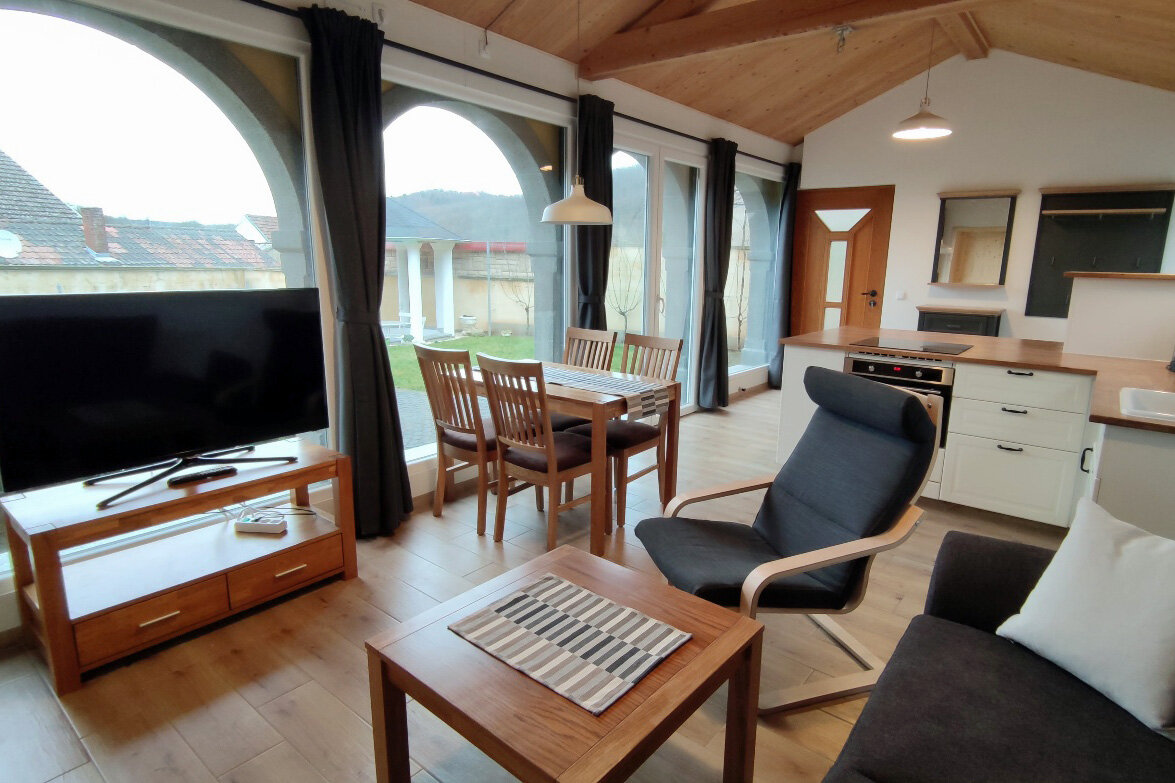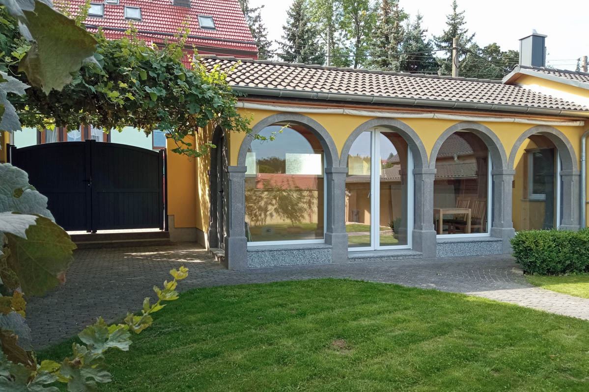 Eine bodentiefe, große Fensterfront bietet Ihnen einen tollen Blick in den von außen uneinsichtigen mediterran angelegten Garten und in den Herlitzenberg von Bad Sulza.