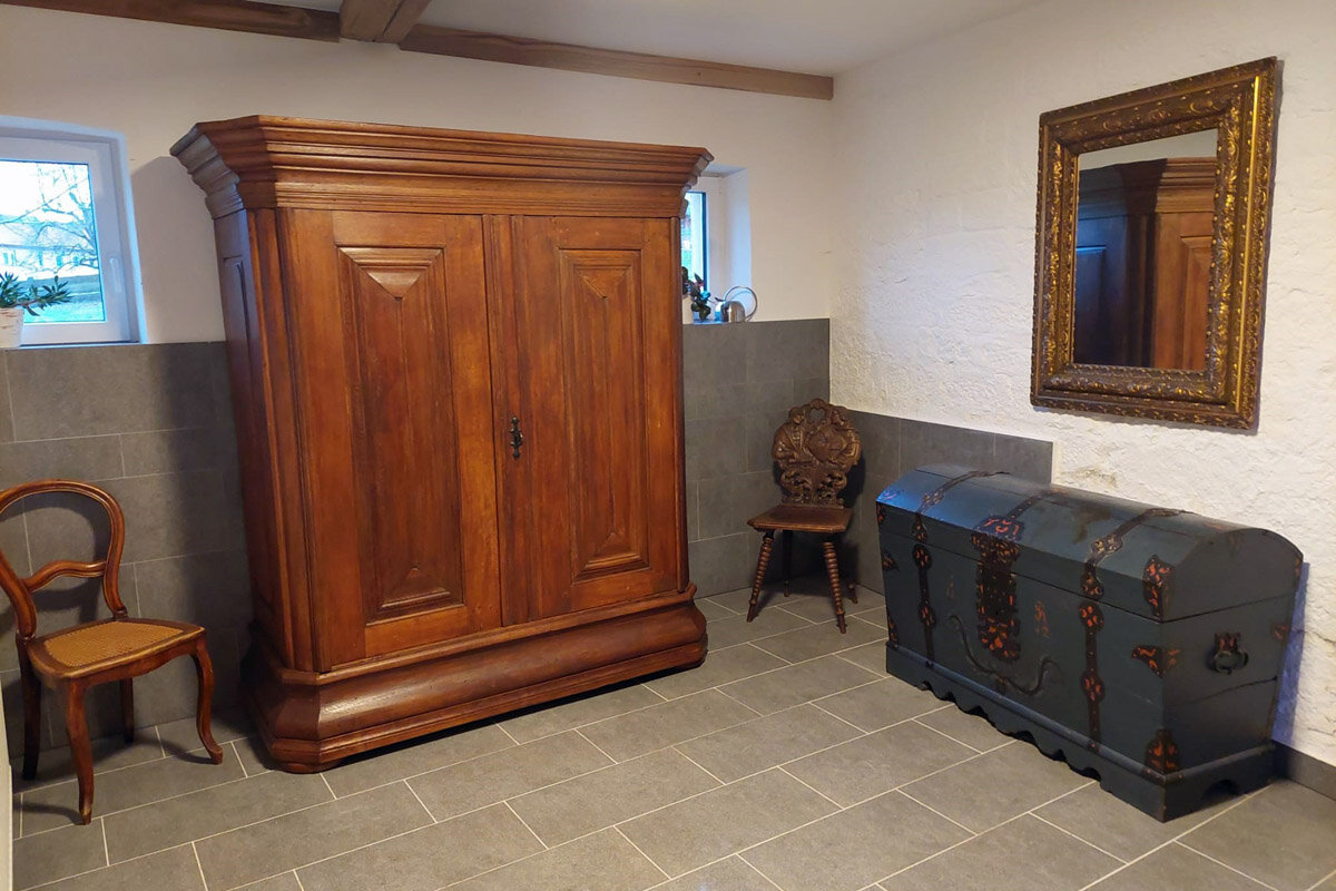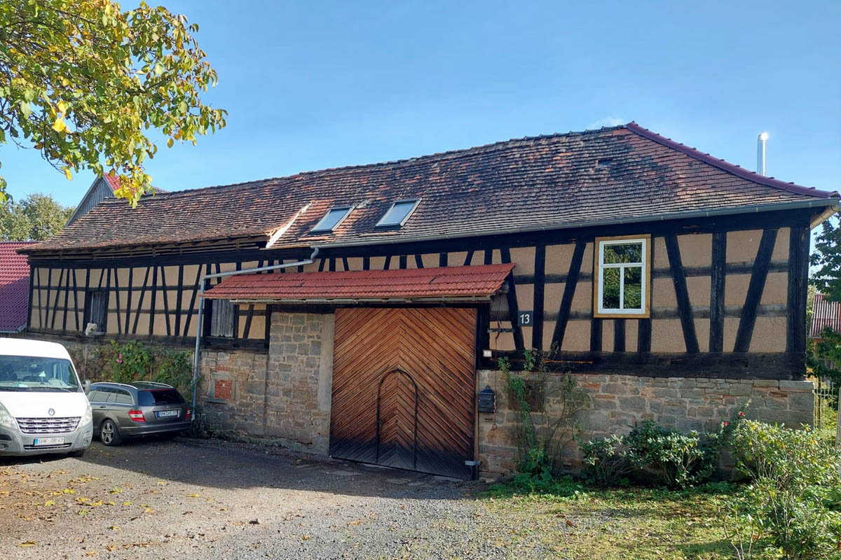 Sie sind Liebhaber historischer Bauernhöfe? Dann ist der Hof in Bollberg genau das Richtige für Sie! Der Hof wurde erstmals 1425 urkundlich erwähnt als Lehnhof des Günther von Bünau. Er ist die älteste Hofstelle in Bollberg, aus dieser Zeit ist der Gewölbekeller unter dem heutigen Wohnhaus erhalten. Die Gebäude wurden um 1860 in Fachwerkbauweise neu errichtet. Heute ist es einer der wenigen komplett erhaltenen 4-Seitenhöfe mit historischem Sandsteinpflaster in Thüringen. 2012 erwarben wir diesen Hof, um hier mit unserem Antikmöbelhandel und Möbel-Restaurationsbetrieb ansässig zu werden. Mit uns leben 2 Hunde und ein Kater.