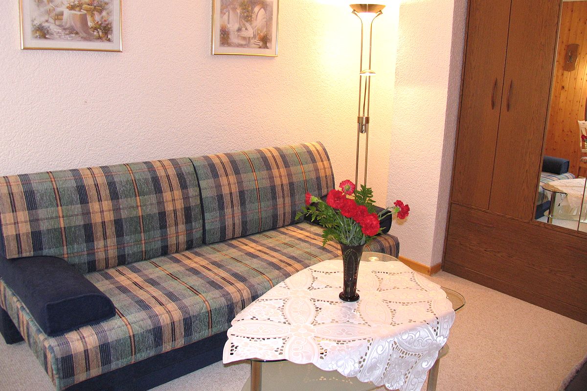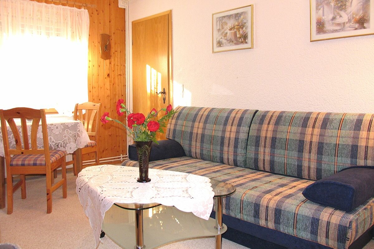 Von da aus gelangen Sie in das Bad mit Dusche/WC bzw. in das kombinierte Wohn-/Schlafzimmer mit Doppelbettcouch und Liege. Hier steht Ihnen Sat-TV und ein Radio zur Verfügung. In der Ferienwohnung sind keine Haustiere erlaubt.