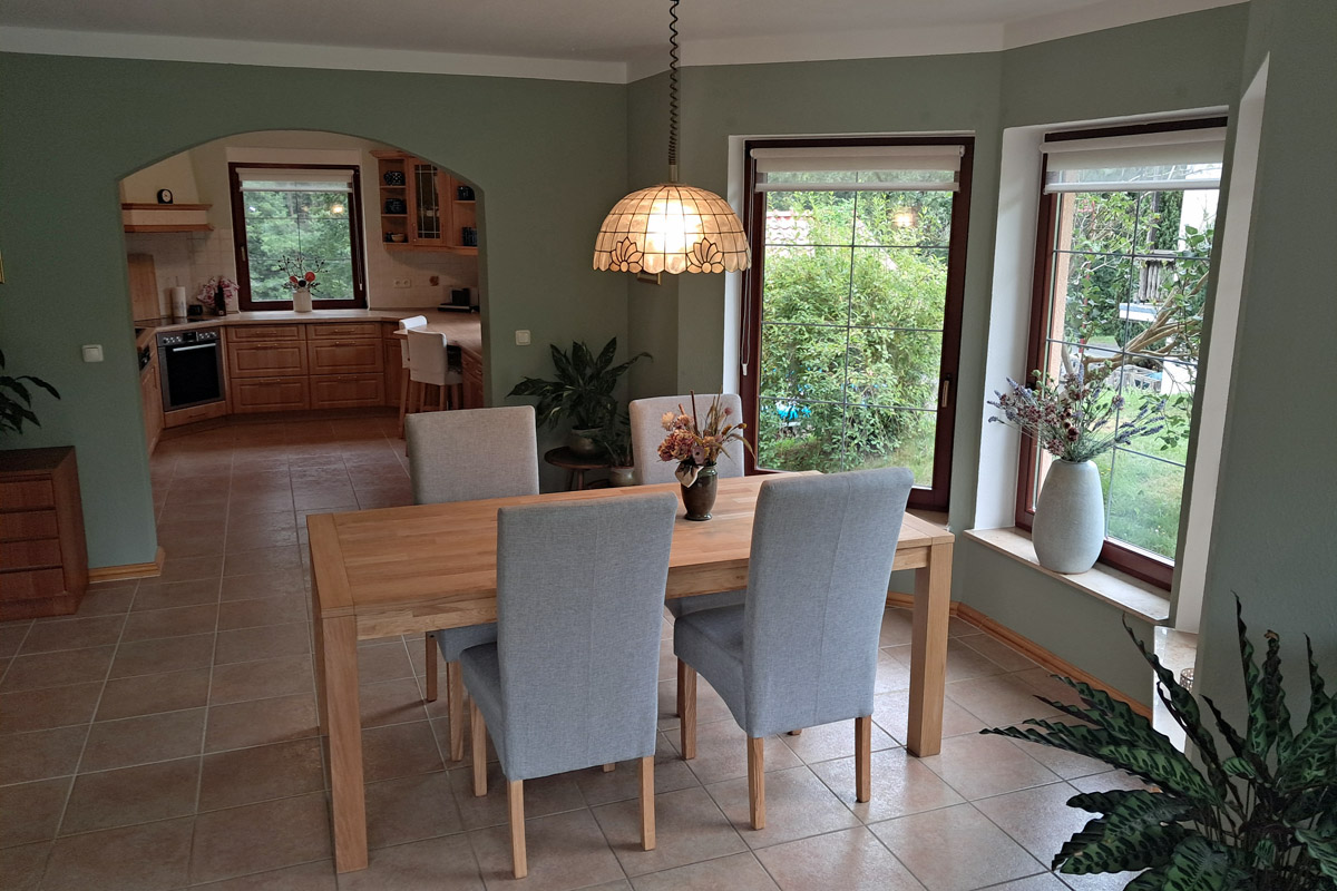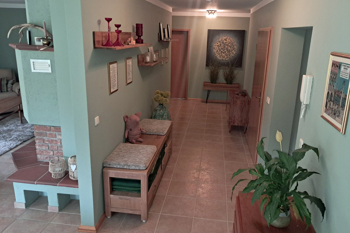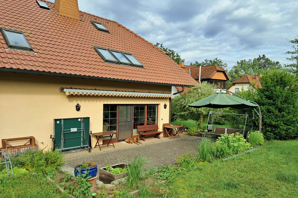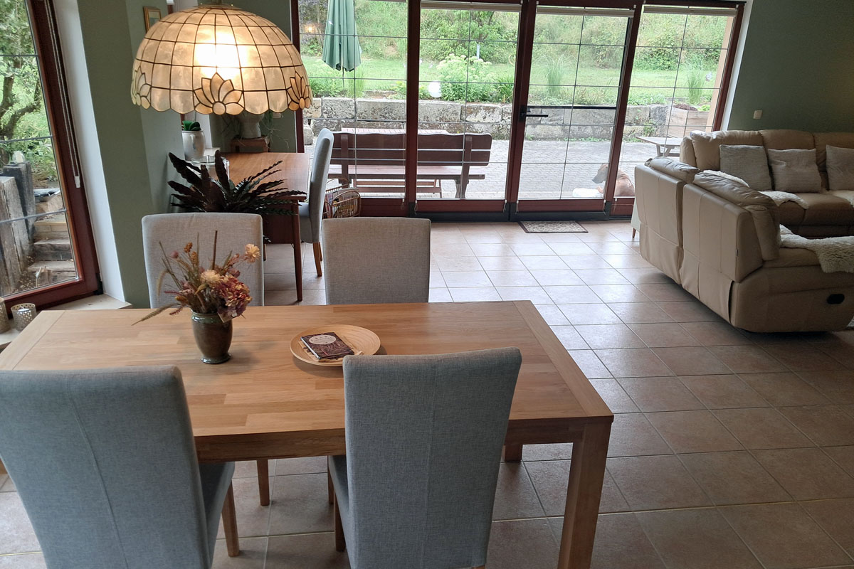 Die Wohnung für bis zu 7 Personen im Erdgeschoß eines Zweifamilienhauses befindet sich sehr ruhig gelegen am Ende einer schönen Wohnsiedlung direkt am Waldrand „Im Tal“ oberhalb des Etzelbaches ca. 1 km von der Saale entfernt. Dadurch ist die Ferienwohnung für Spaziergänge und Wanderungen, sowie Radtouren und Bootstouren ein idealer Startpunkt.