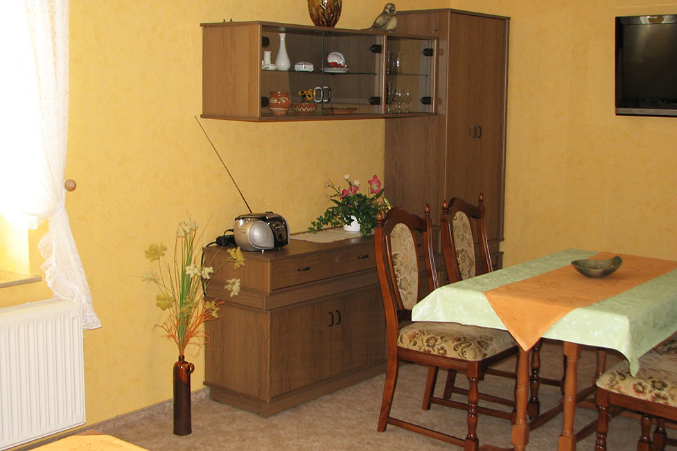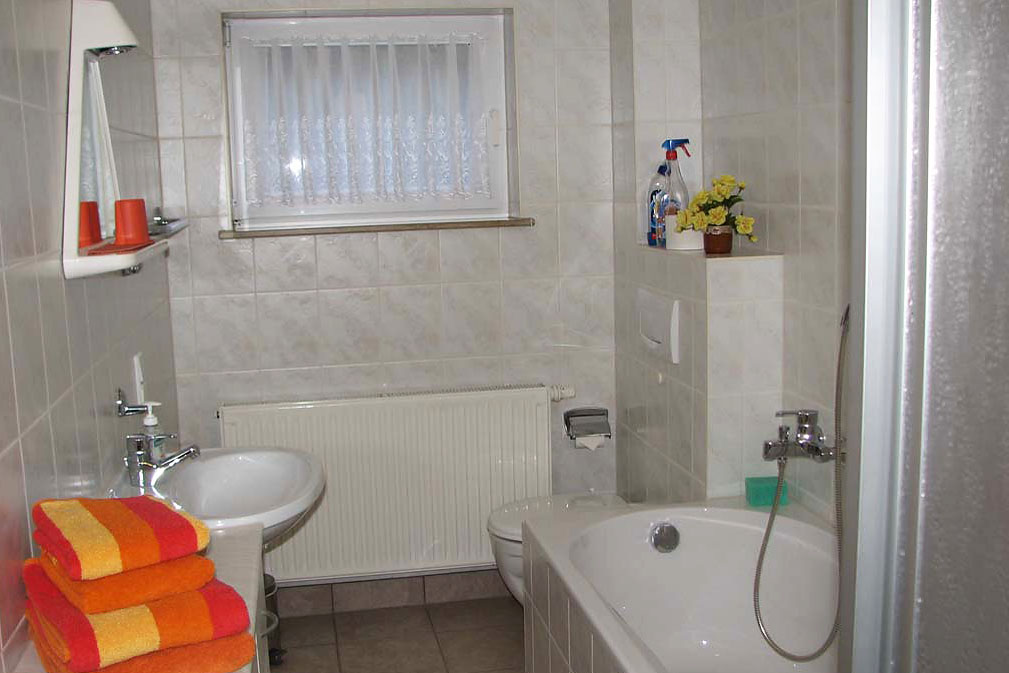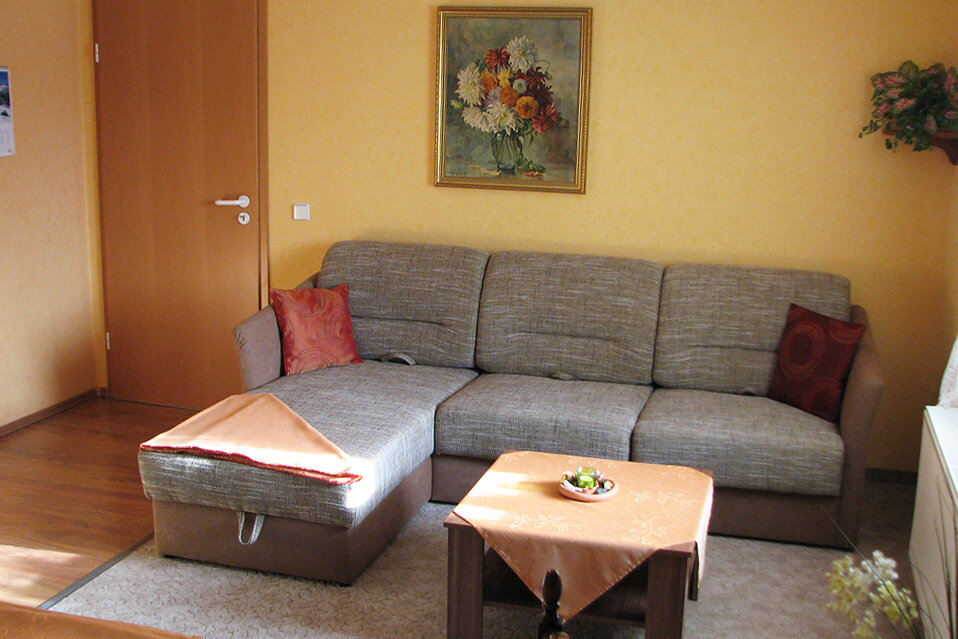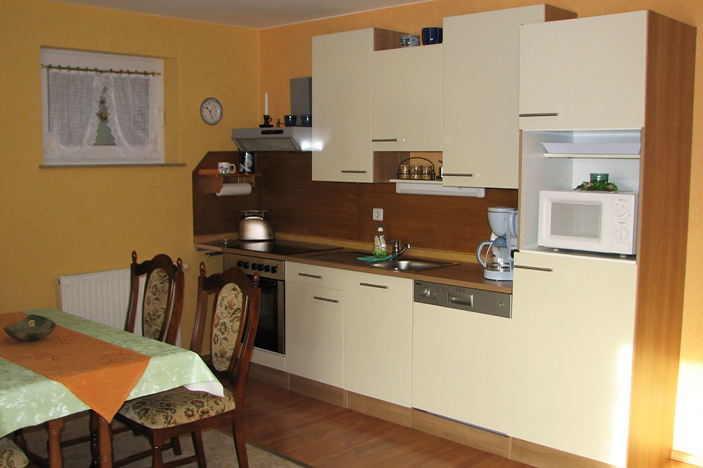In unserer Ferienwohnung finden Sie auf 56 qm alles, was Ihren Aufenthalt so angenehm wie möglich gestaltet. Unsere Nichtraucher-Ferienwohnung, in der 2 bis 4 Erwachsene und ein Kleinkind Platz finden, erreichen Sie über einen separaten Eingang. Die Ausstattung umfasst ein senioren-gerechtes Bad mit Dusche und WC, ein Schlafzimmer mit Doppelbett, das Wohnzimmer mit ausziehbarer Couch und SAT-TV sowie eine moderne Einbauküche mit Essbereich.