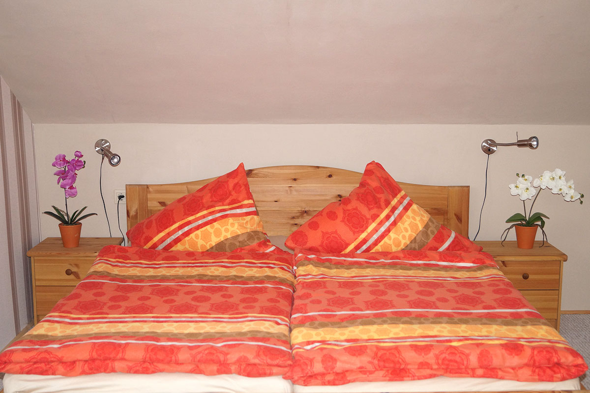 Im Obergeschoss befinden sich ein größeres Schlafzimmer mit einem großen Doppelbett und ein kleineres Schlafzimmer mit 2 Einzelbetten (evtl. für die Kinder).