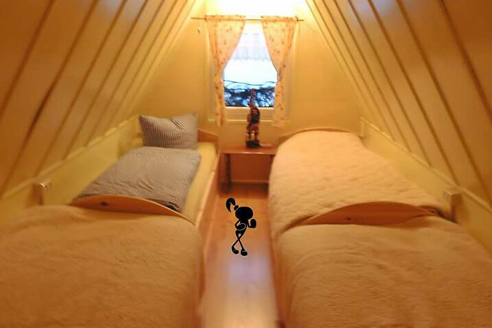 Dachgeschoss: 1 Schlafraum (mit Tür und 4 unter der Dachschräge eingebauten Betten)