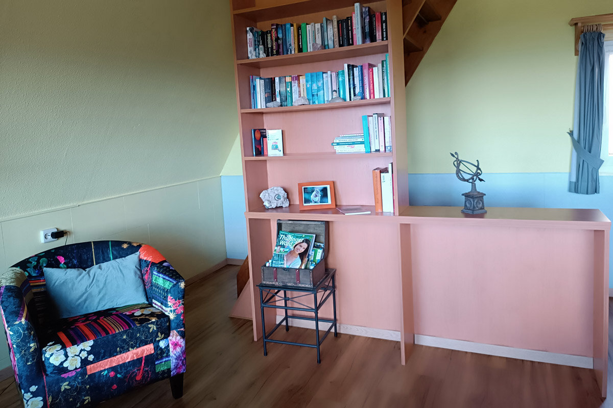 Obergeschoss: 1 Wohn/Schlafraum (2 Betten), Radio, kleine Bibliothek, gemütliche Leseecke und überdachter, möblierter Balkon (inkl. 2 Sonnenliegen)