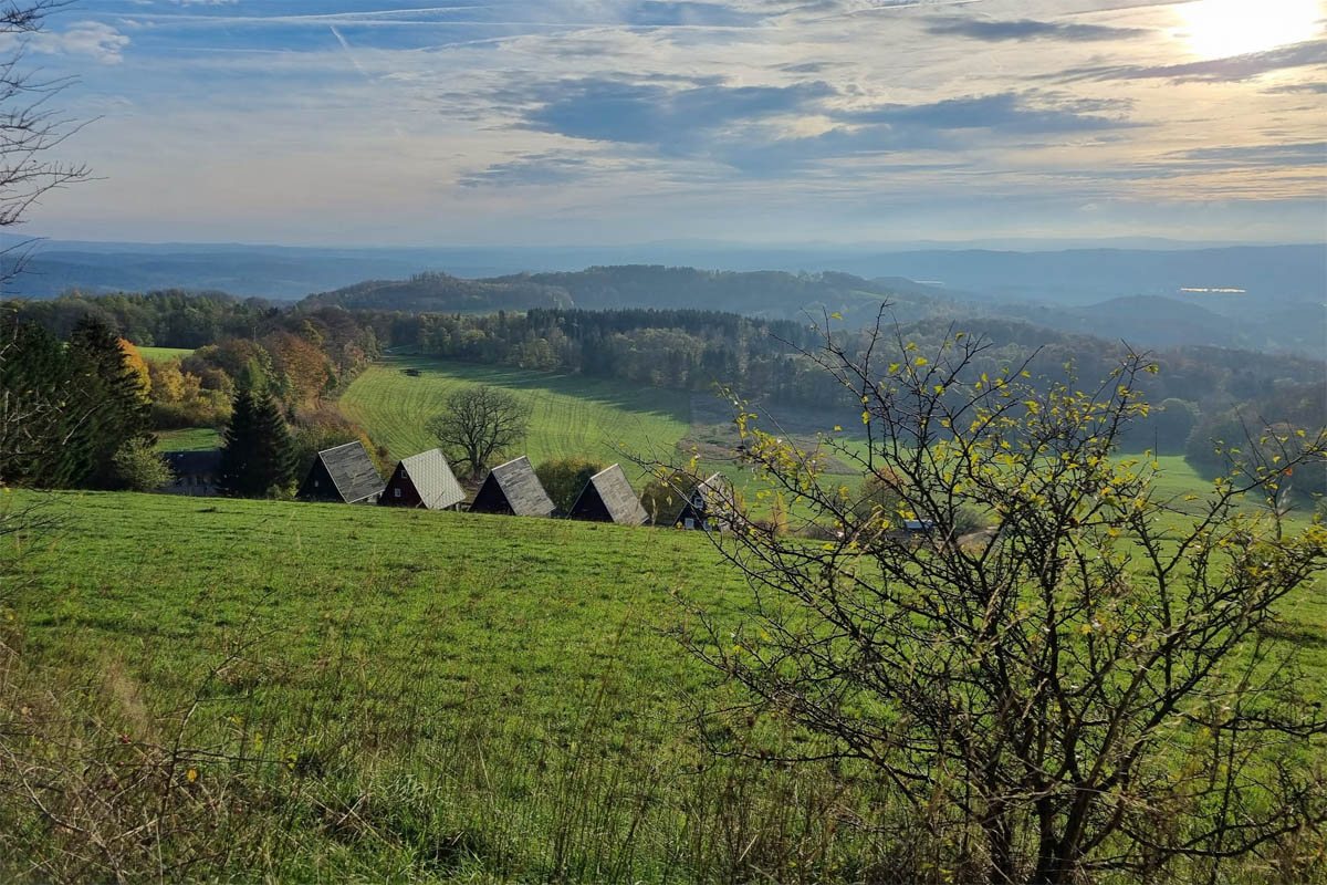 Unsere romantischen Hüttchen "Zum Anhimmeln", in Gipfellage der Hohen Klinge / Trusetal, (ca 650 m NN) sind Ausgangspunkt für erlebnisreiche Begegnungen mit Land und Leuten des Thüringer Waldes.