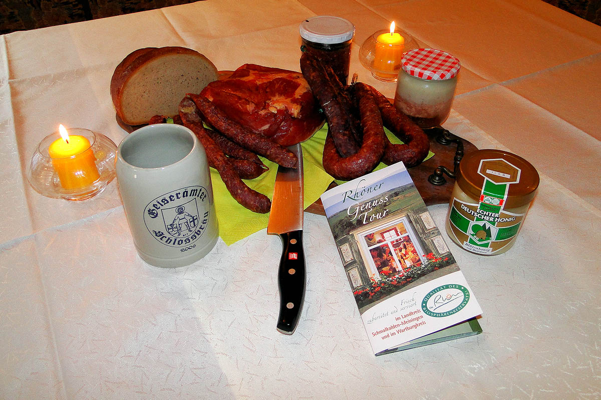 Hier finden Sie immer eine passende Räumlichkeit z. B. für Ihre Familien- oder Geschäftsfeier. Wir verwöhnen Sie mit regionalen Rhöner Produkten und bekannten Thüringer Spezialitäten. In der warmen Jahreszeit können Sie sich bei einem erfrischenden Getränk in unserem großen Biergarten entspannen.
