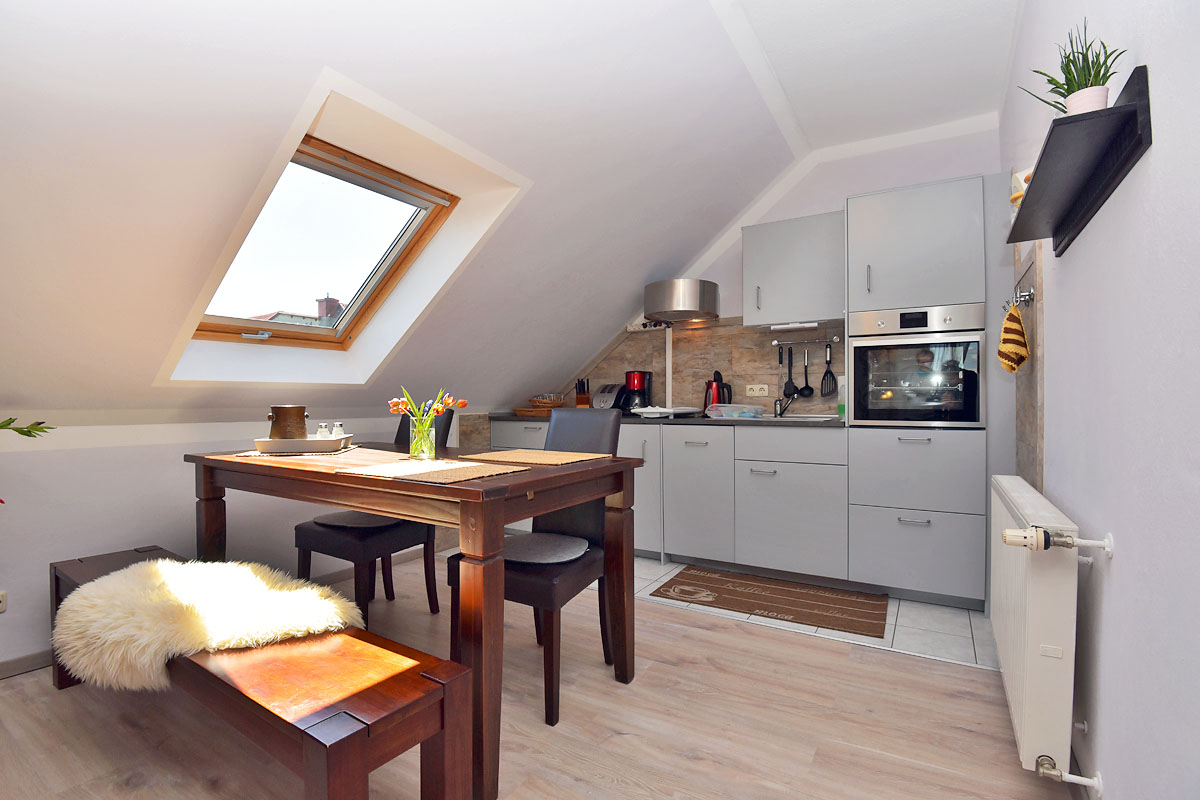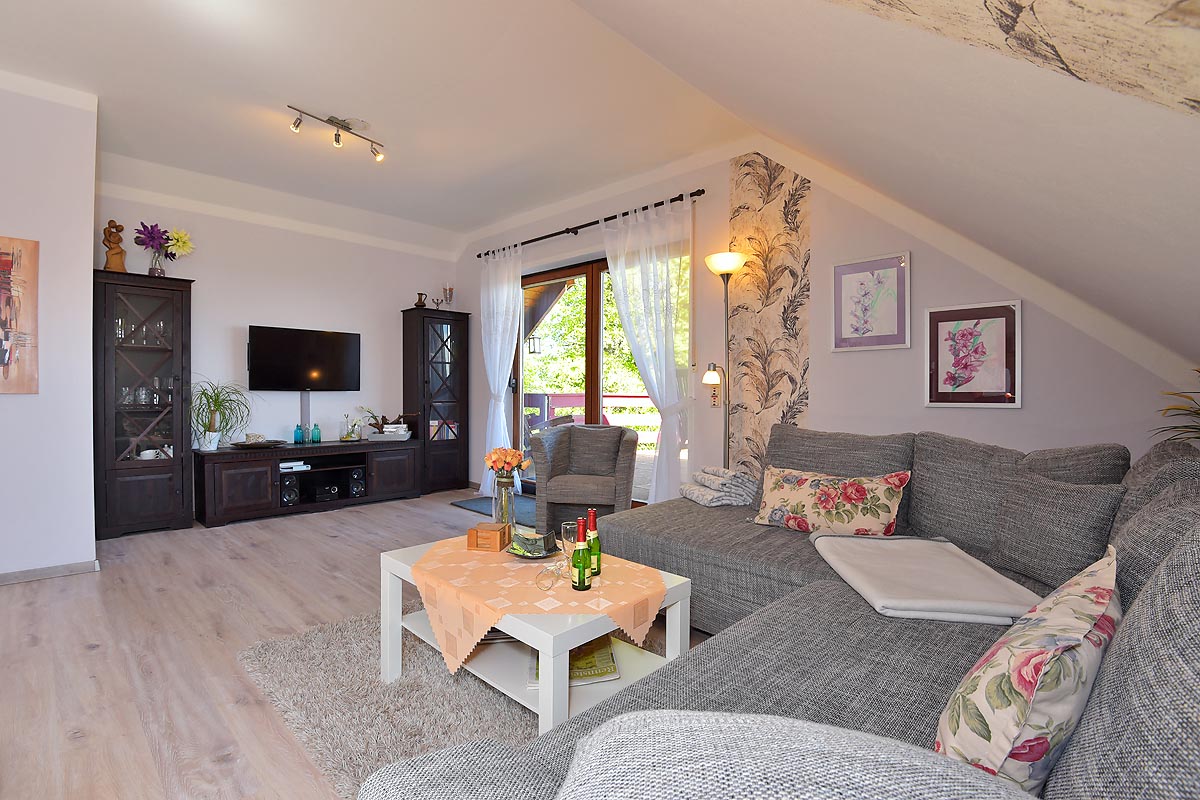 Die 65 qm Nichtraucher-Ferienwohnung im Obergeschoss ist geschmackvoll eingerichtet und bietet alles, was Sie zum Wohlfühlen brauchen. Von hier haben Sie einen traumhaften Blick auf die umliegenden Bergwiesen und Wälder.