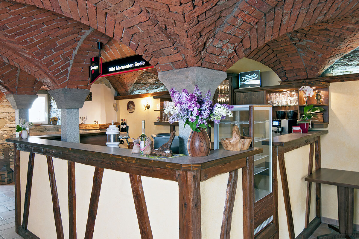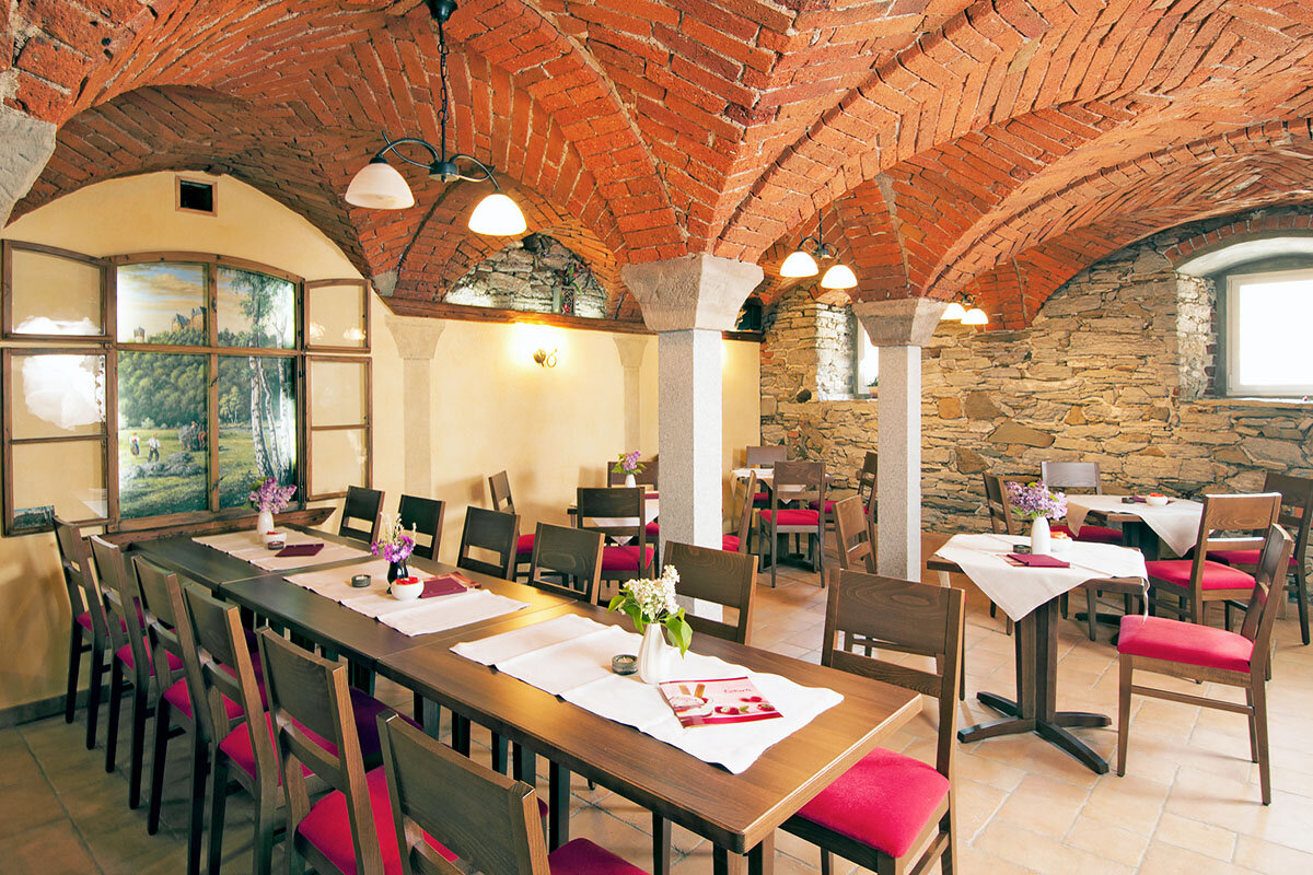 In zwei schön sanierten und restaurierten ebenerdigen Kreuzgewölbekellern finden 32 bzw. 16 Personen Platz. Im Sommer bietet ein mit Blumen und Pflanzen dekorierter Innenhof nochmals Platz für bis zu 30 Personen.
