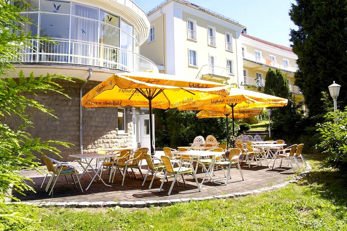 Von allen Räumlichkeiten aus haben Sie einen direkten Zugang zur Terasse bzw. zum Balkon, mit herrlichem Blick zum Thüringer Wald und zum Inselsberg. Des weiteren bieten sich großzügig angelegte Parkanlagen für Ihre Freiluftpräsentation an.