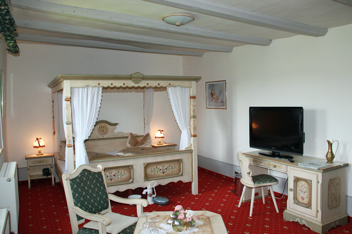 Schlafen in herrschaftlicher, ländlicher Atmosphäre - unsere Hochzeitssuite ist stilvoll eingerichtet und macht mit ihrem romantischen Himmelbett ihrem Namen alle Ehre.