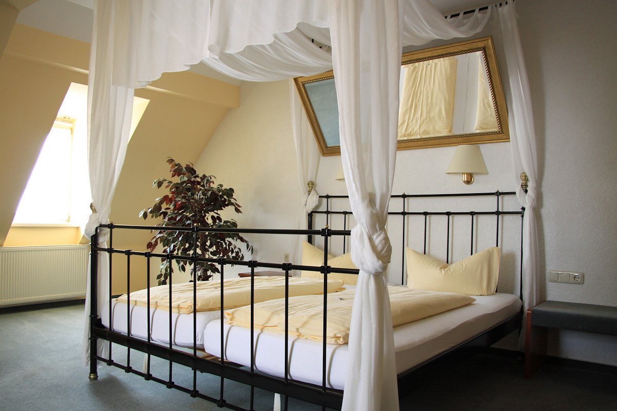Besonders beliebt ist unsere Hochzeitssuite mit Himmelbett, die wir kostenlos an das glückliche Paar vergeben, wenn die Hochzeitsfeierlichkeiten in unserem Hause stattfinden.